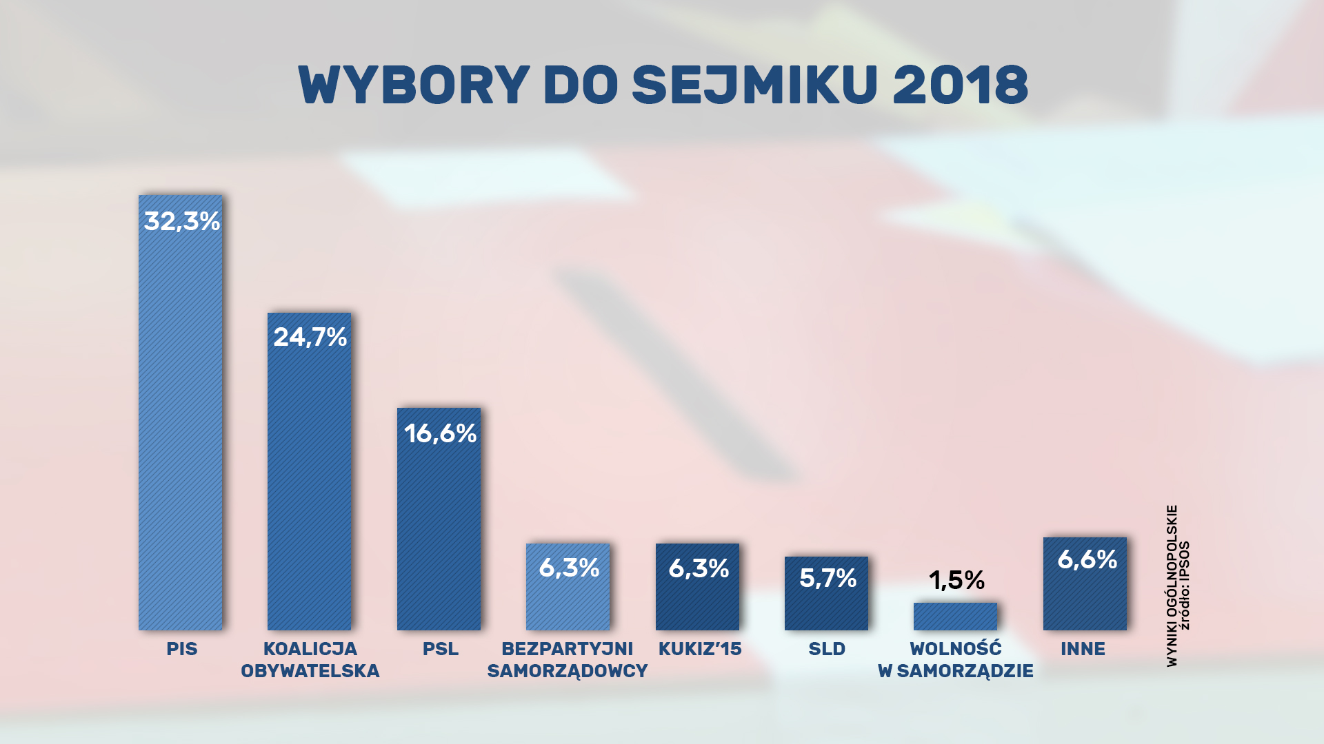 Do urn w wyborach samorządowych poszło ponad 50 procent wyborców - to jedna z najwyższych frekwencji w historii. Jak będzie wyglądać polityczna mapa samorządów w Polsce. Po wyborach w sejmikach wiele może się zmienić. W sondażu IPSOS w Polsce wygrywa Prawo i Sprawiedliwość, zdobywa 32,3 %, później Koalicja Obywatelska 24, 7 %, PSL 16,6%, Kukiz' 15 6,3 %, Bezpartyjni samorządowcy 6,3%, SLD Lewica razem 5,7%, Wolność 1,5%.