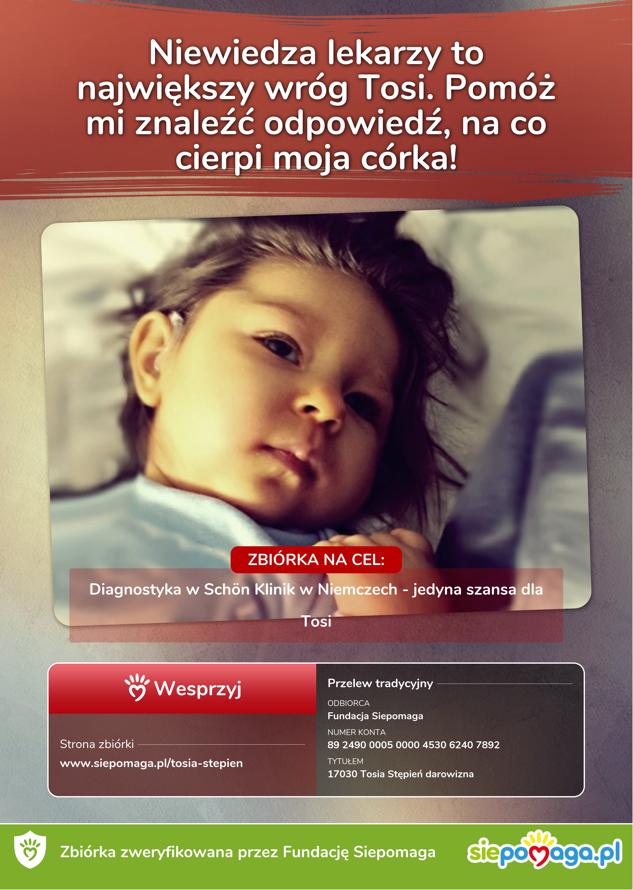 Dziewczynka otrzymała dużą pomoc od przyjaciół i rodziny. Zorganizowano już zbiórki na jej rzecz oraz wydano książkę charytatywną - PrzyTulanki - opowiadania i wiersze dla dzieci. Cały dochód ze sprzedaży książki trafia na konto Tosi w Fundacji Kawałek Nieba. Dzięki sprzedaży publikacji udało się już wpłacić połowę kwoty do kliniki w Niemczech.