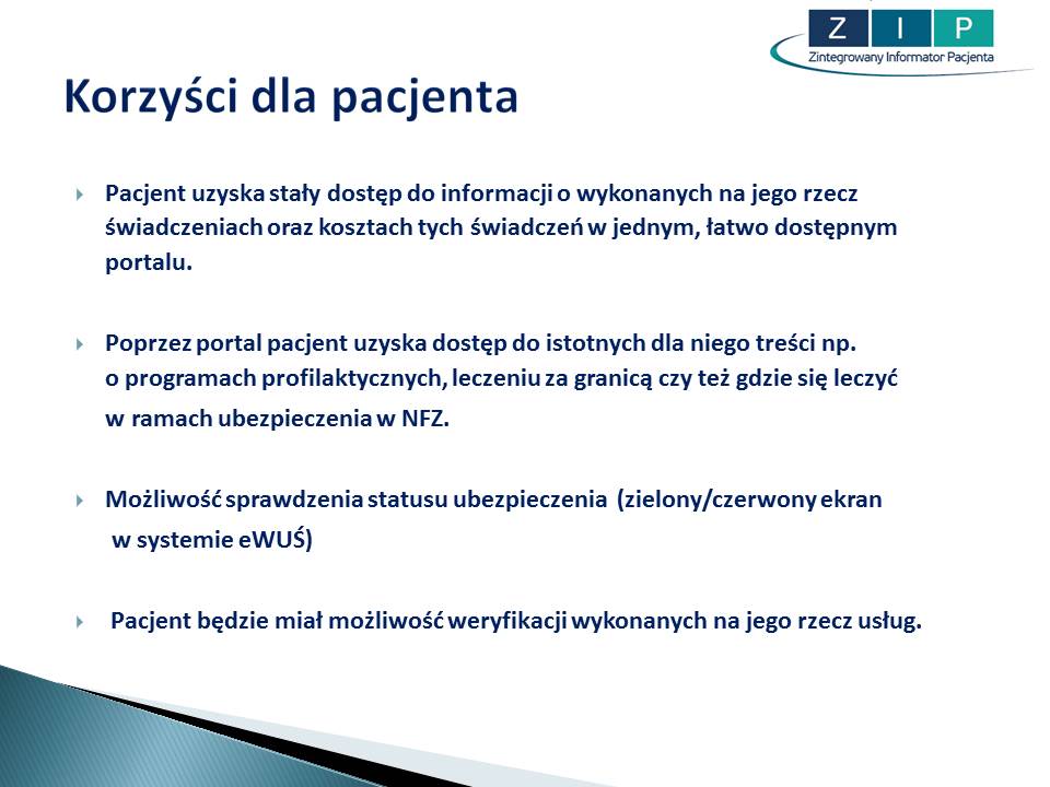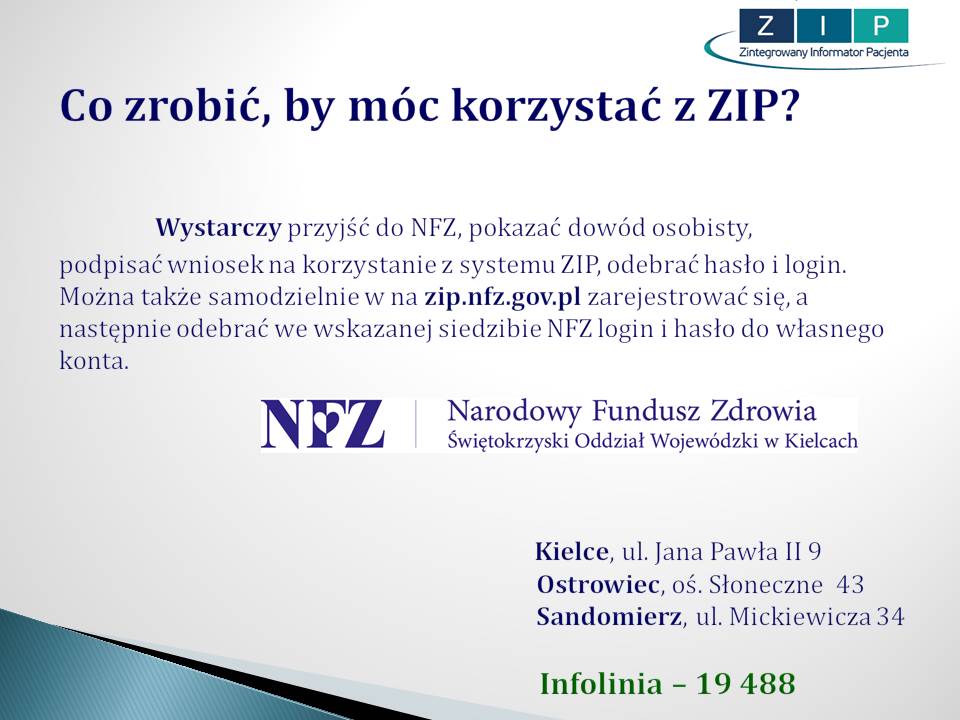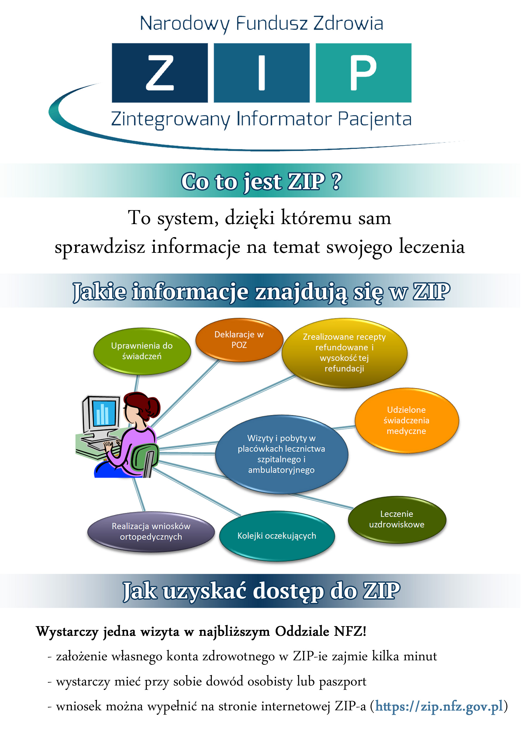Zintegrowany Informator Pacjenta (ZIP) - to specjalny portal, dzięki któremu każdy zainteresowany po zalogowaniu na swoim komputerze może między innymi: