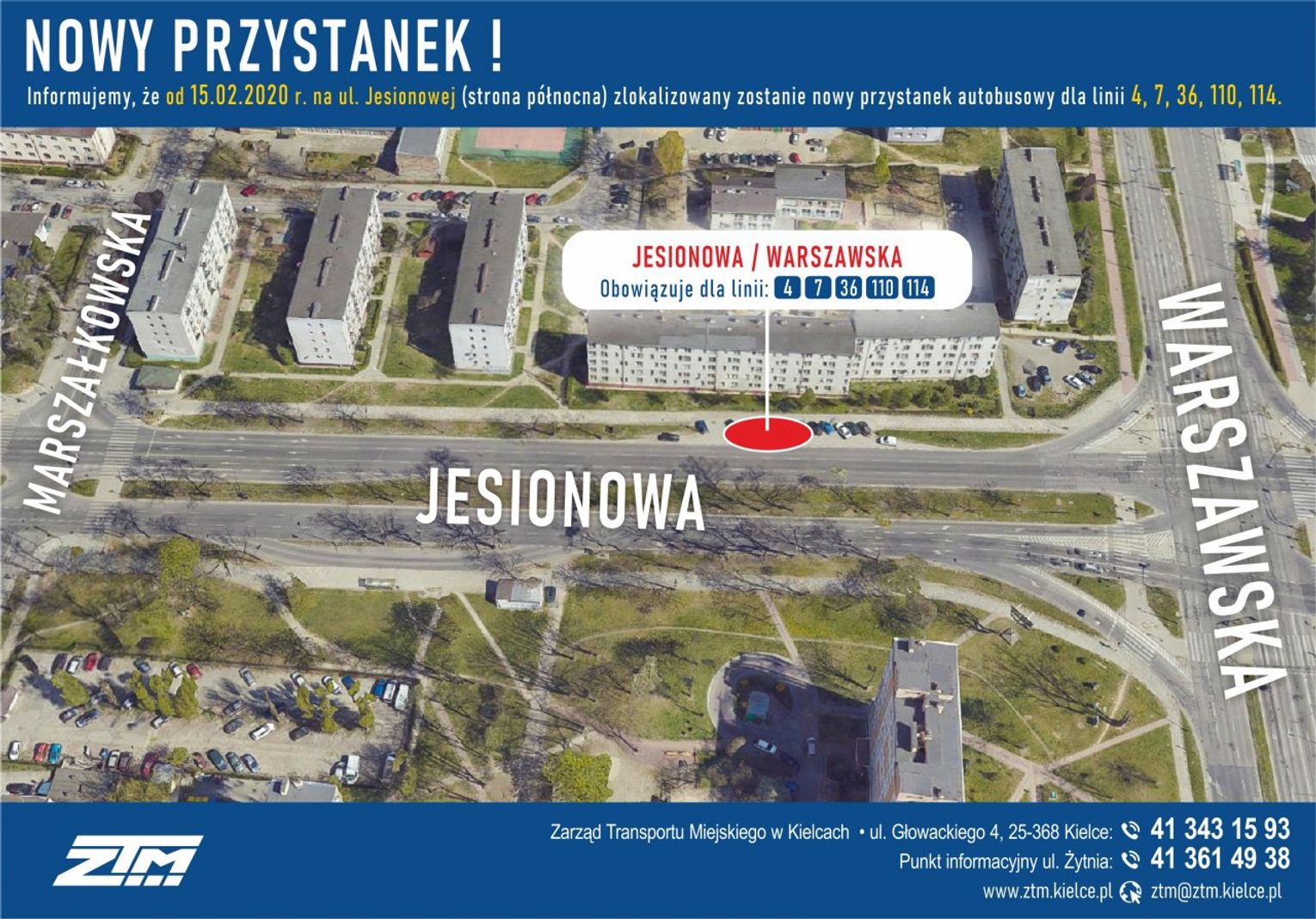 Od najbliższej soboty, na ulicy Jesionowej dla autobusów linii 4, 7, 36, 110 oraz 114 jadących od ulicy Warszawskiej i Świętokrzyskiej będzie obowiązywał nowy przystanek o nazwie Jesionowa / Warszawska. Jest on zlokalizowany w zatoce w pobliżu skrzyżowania z ulicą Warszawską.