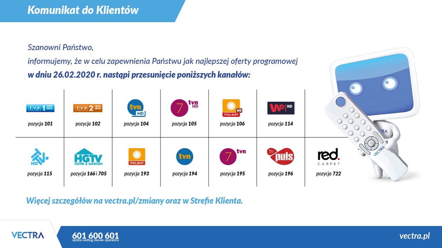 Listę kanałów i ich nowych pozycji oraz film instruktażowy jak ustawić od nowa na swojej liście ulubionych kanałów ten, który zmienił położenie, można znaleźć pod linkiem >>> www.vectra.pl/zmiany