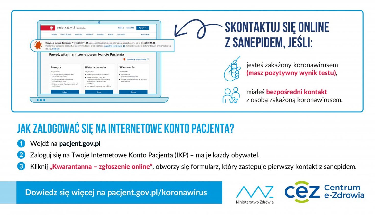 Na Internetowe Konto Pacjenta (IKP) należy się logować poprzez stronę pacjent.gov.pl. Każdy po zalogowaniu zobaczy po prawej stronie obok powitania napis „Kwarantanna – zgłoszenie online” wraz z czerwoną ikonką przedstawiającą koronawirusa. Wystarczy kliknąć na napis „Kwarantanna – zgłoszenie online”, by znaleźć się na stronie formularza i wypełnić wywiad epidemiologiczny. Ułatwieniem jest to, że formularz kontaktowy do sanepidu dostępny jest z poziomu Internetowego Konta Pacjenta i nie ma potrzeby logować się dodatkowo, aby autoryzować swoje dane. Po wysłaniu zgłoszenia należy czekać na kontakt ze strony sanepidu.
