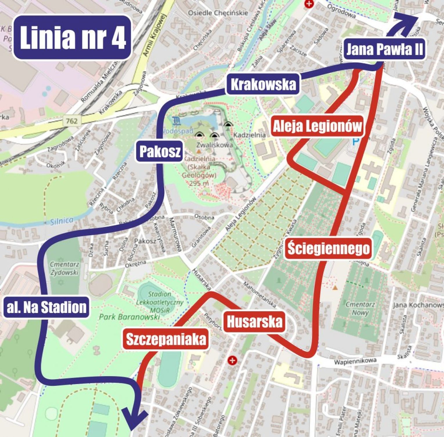 - trasa autobusów linii 4 zostaje częściowo zmieniona. Wszystkie kursy w obie strony będą realizowane ulicą Krakowską, Pakosz i al. Na Stadion.