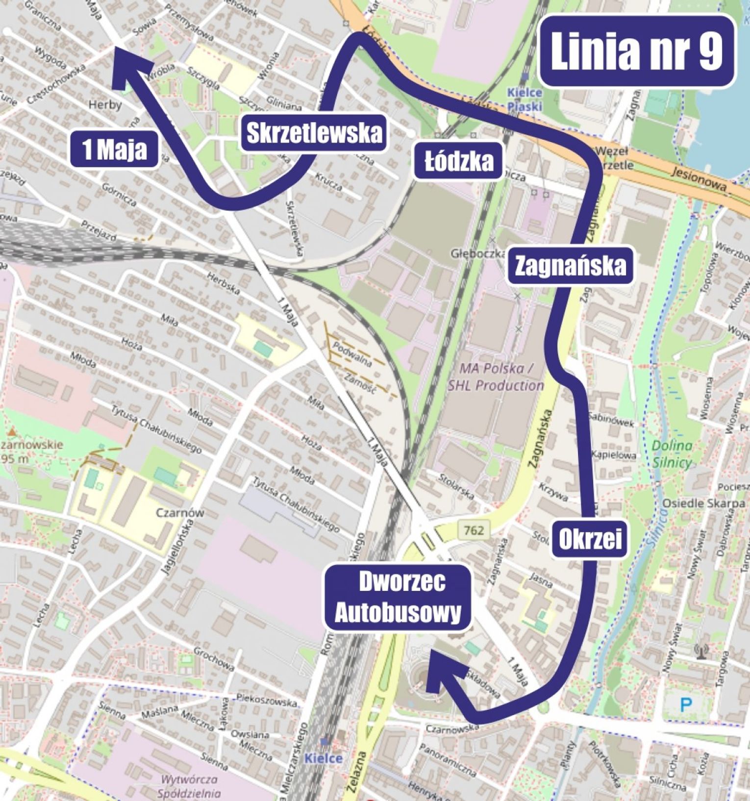 · od soboty 27 marca 2021 roku autobusy podmiejskiej linii 9 zostaną przekierowanie do Dworca Autobusowego przy ulicy Czarnowskiej 12 w Kielcach i nie będą już obsługiwały trasy Ślichowice – Massalskiego – Szajnowicza-Iwanowa/Puscha – Grunwaldzka – Żytnia – Paderewskiego. Jednocześnie zmienią się godziny kursowania.