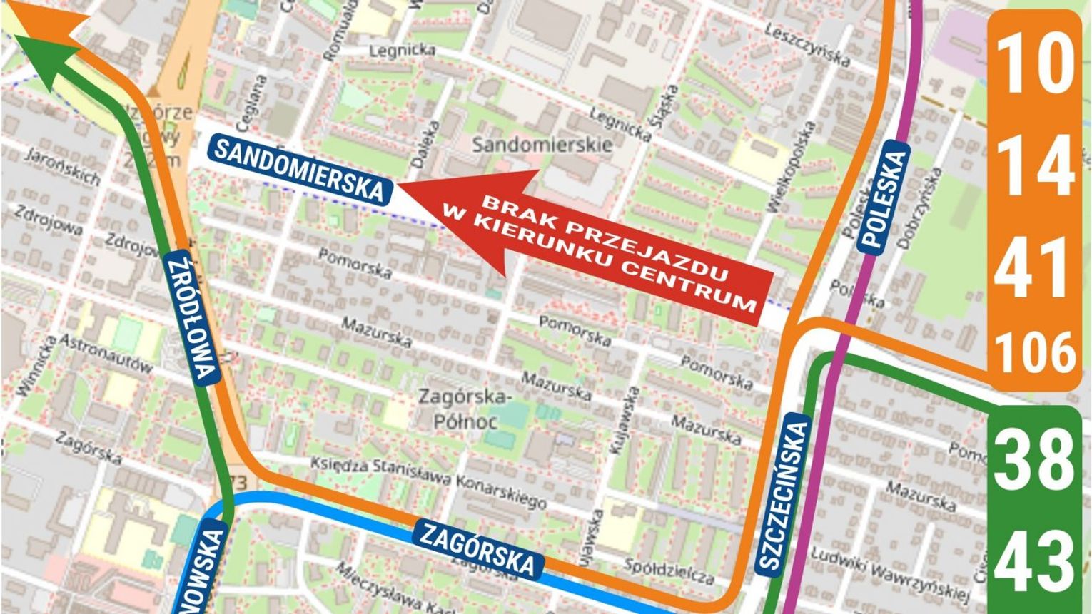 - 10, 14, 41, 106, 109 w kierunku centrum miasta będą kursowały przez ul. Szczecińską, Zagórską i Źródłową