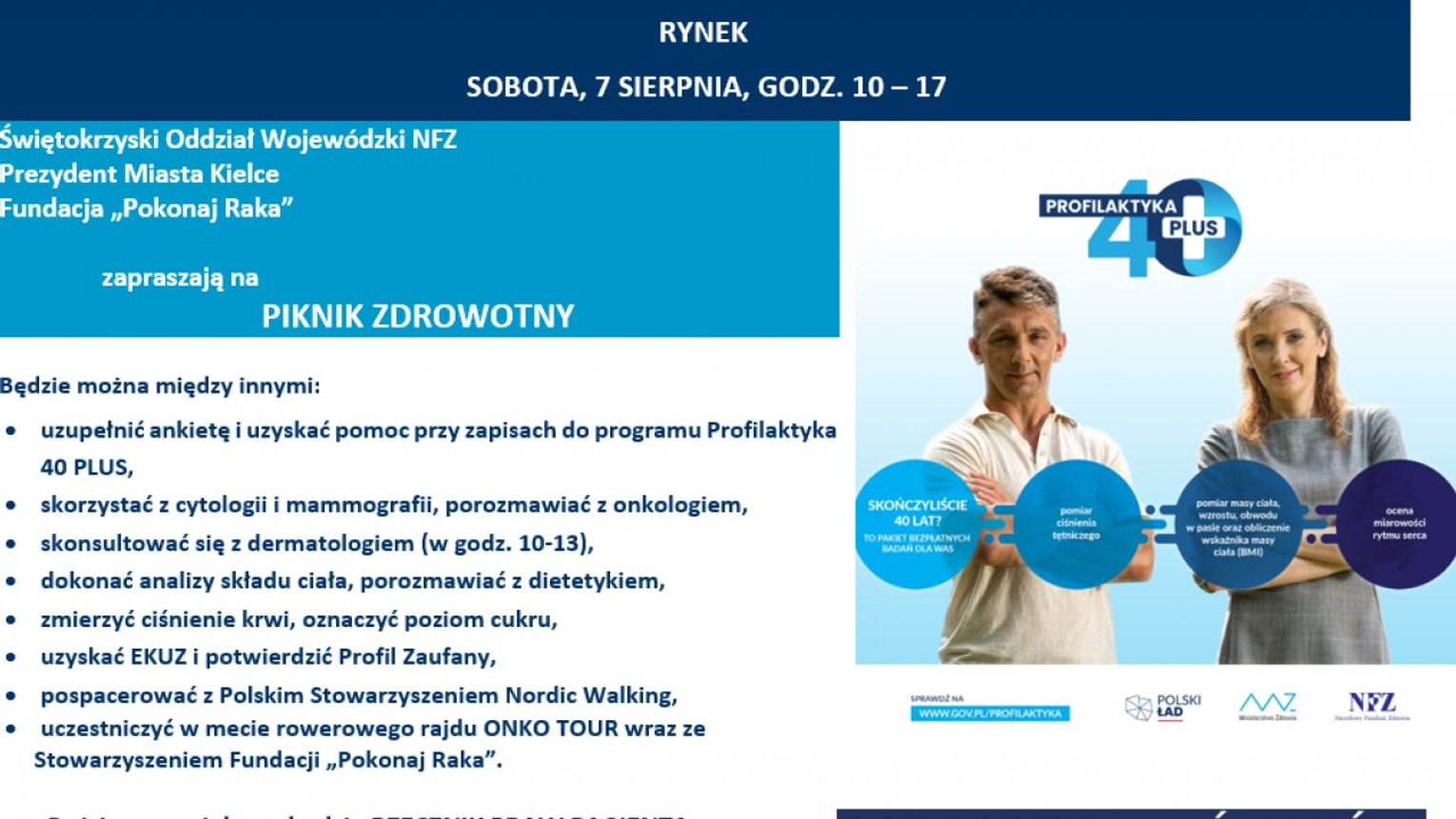 Już 7 sierpnia w godz. 10 - 17 Świętokrzyski Oddział Wojewódzki NFZ i Prezydent Miasta Kielce zapraszają na kielecki Rynek. Wraz z Fundacją „Pokonaj Raka”, która właśnie tego dnia kończy w stolicy województwa świętokrzyskiego swój tygodniowy, rowerowy ONKO TOUR trasą Green Velo z Rzeszowa do Kielc, chcemy pokazać, że profilaktyka się opłaca, a systematyczne badania kontrolne, aktywność fizyczna, zdrowe odżywianie to klucz do naszego zdrowia. A mamy doskonałe narzędzia, by z tego wszystkiego korzystać, jak chociażby działający od 1 lipca projekt „Profilaktyka 40 Plus”.