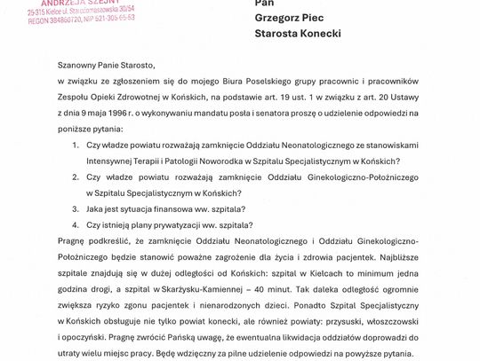 Poseł Szejna zareagował na zgłoszenie jakie dotarło do biura poselskiego ministra, a które złożyła grupa pracownic i pracowników ZOZ w Końskich. Andrzej Szejna wystosował zapytanie do starosty Grzegorza Pieca w którym pyta czy powiat rozważa zamknięcie Oddziału Neonatologii? Czy władze powiatu rozważają zamknięcie Oddziału Ginekologiczno – Położniczego? Jaka jest sytuacja finansowa szpitala? Czy istnieją plany prywatyzacji szpitala?