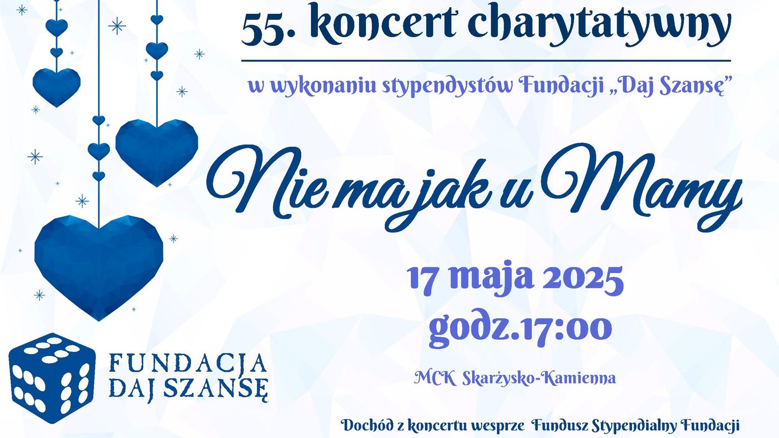 55. koncert charytatywny w wykonaniu stypendystów Fundacji pt. „Nie ma jak u Mamy” odbędzie się 17.05.2025 r. o godzinie 17:00 w Miejskim Centrum Kultury (Sala widowiskowa) w Skarżysku-Kamiennej (ul. Słowackiego 25).