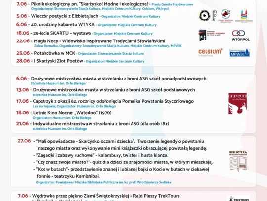 A to tylko wycinek wielu wydarzeń, imprez, warsztatów i spotkań. Zachęcamy do zajrzenia na strony Urzędu Miasta oraz Miejskiego Centrum Kultury, gdzie można znaleźć całą rozpiskę na czerwiec.