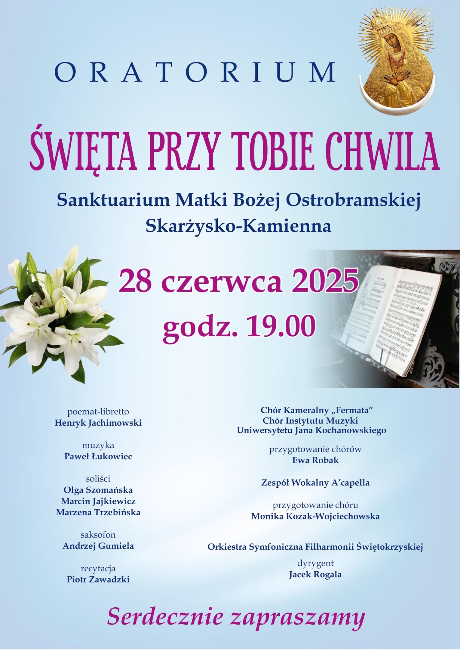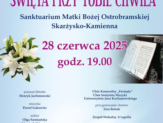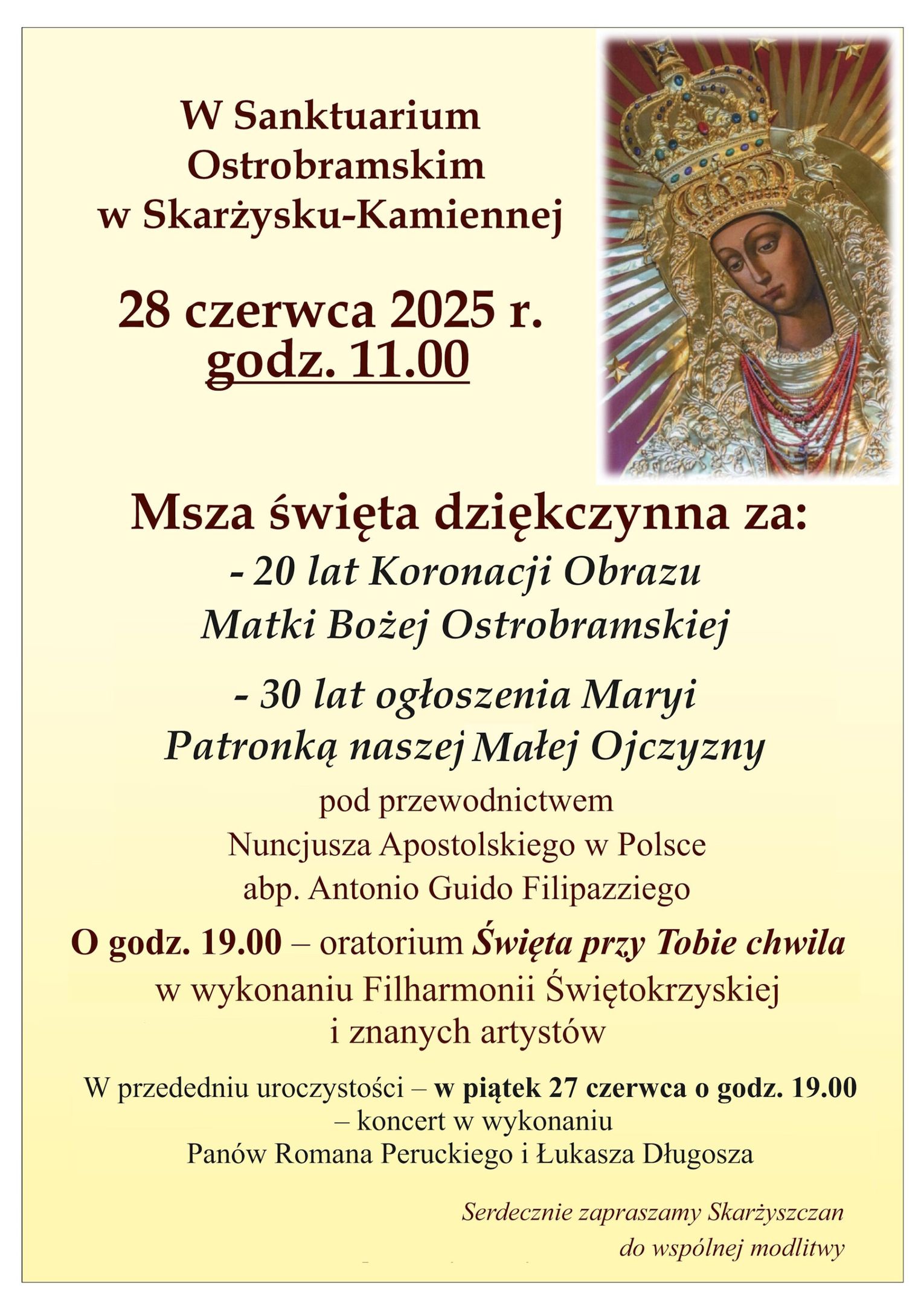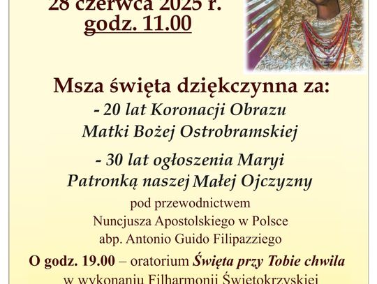Przygotowujemy się do uroczystych obchodów 20. rocznicy koronacji obrazu Matki Bożej Ostrobramskiej i 30. rocznicy ogłoszenia patronką naszego miasta Matki Bożej. Już zaczynamy świętowanie w piątek, bo w piątek wieczorem o godzinie 19:00 odbędzie się koncert organowy. W sobotę przybywa ksiądz arcybiskup nuncjusz apostolski i na pewno podniesie to rangę tego wydarzenia. O godzinie 11:00 będzie sprawowana uroczysta msza święta. Na koniec mszy świętej będzie zawierzenie właśnie Matce Bożej naszego miasta. Natomiast w sobotę o godzinie 19:00, chciałem serdecznie też zaprosić, na koncert filharmonii świętokrzyskiej.