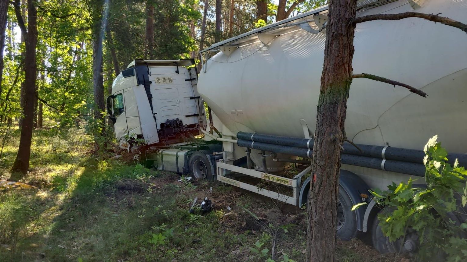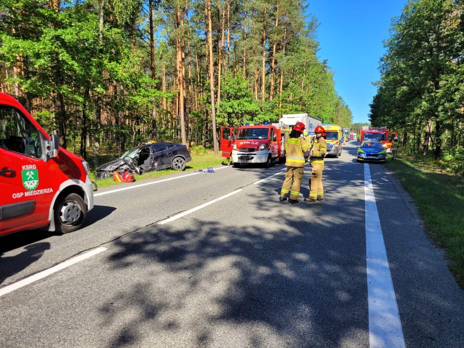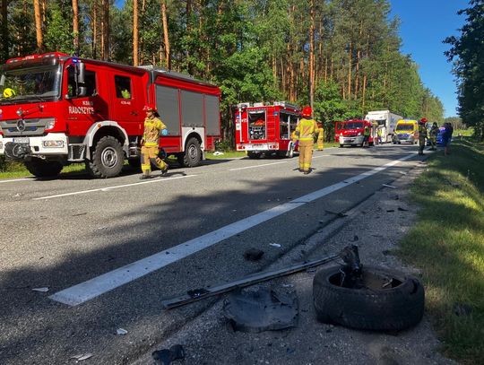 Ciężarówka zderzyła się z autem osobowym. W działaniach ratunkowych bierze udział pięć zastępów straży w tym trzy z OSP. W samochodzie osobowym został zakleszczony kierowca, który trafiłm pod opiekę Zespołu Ratownictwa Medycznego. Kierowca ciężarówki nie odniósł żadnych obrażeń. Droga w obu kierunkach jest aktualnie zablokowana. Przyczyny zdarzenia bada policja.