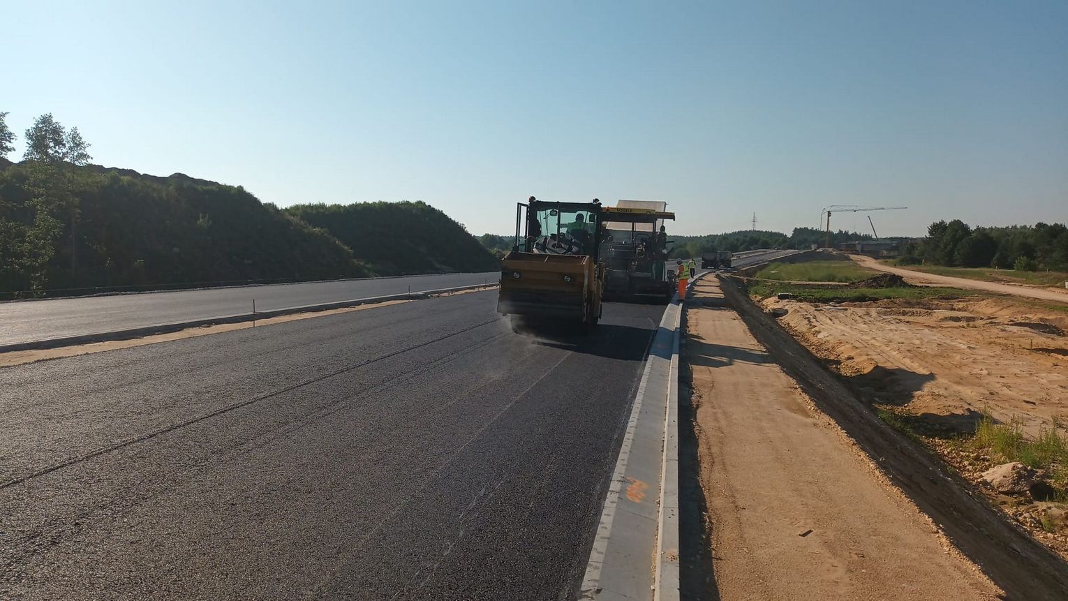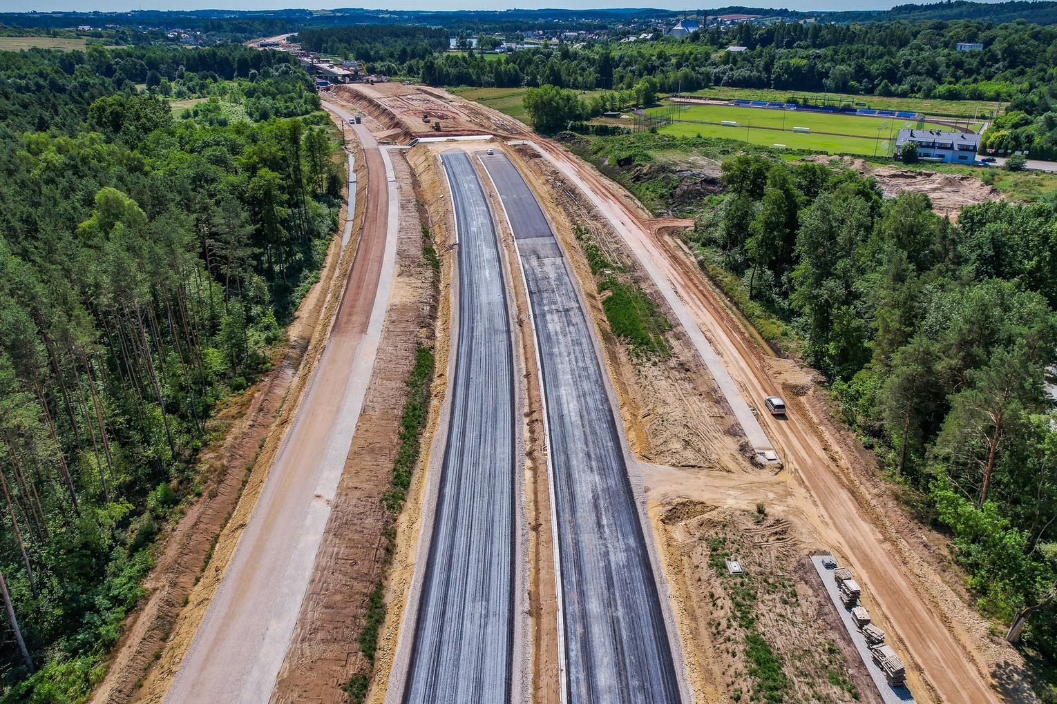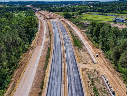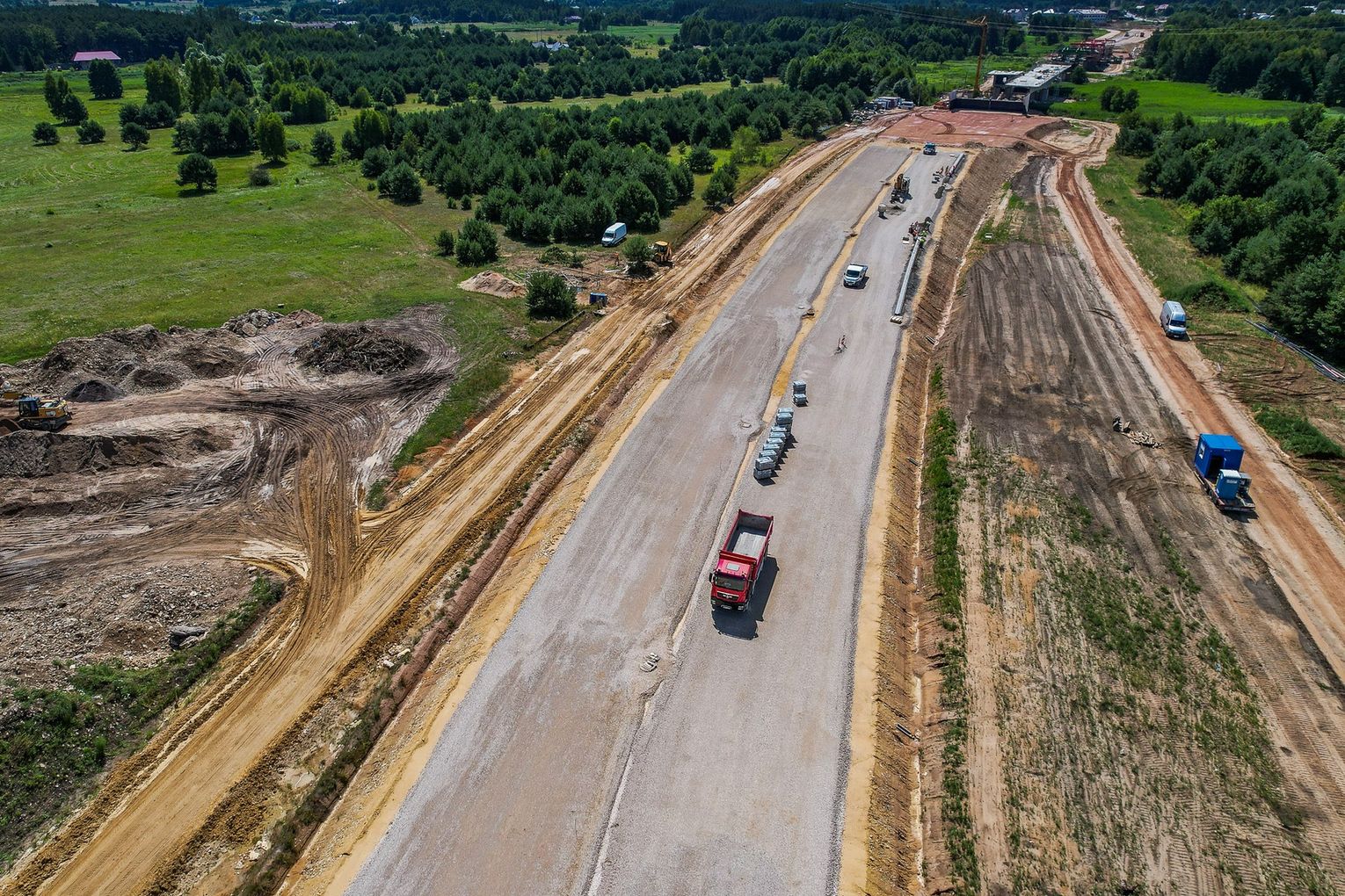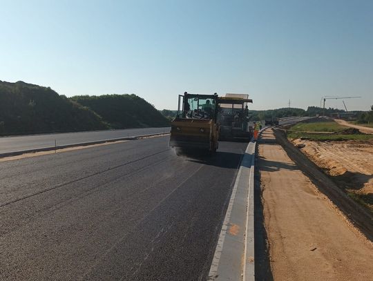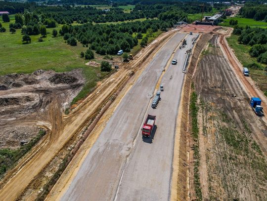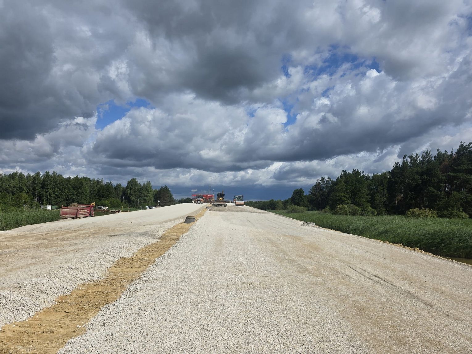 Równocześnie z robotami ziemnymi, pracami przy nasypach i wykopach, wykonywane są pierwsze odcinki podbudowy bitumicznej pod kolejne warstwy nawierzchni – wiążącą i ścieralną. Widoczny jest nie tylko ślad przyszłej obwodnicy Morawicy i Woli Morawickiej, ale także dwóch rond – na początku i na końcu odcinka.