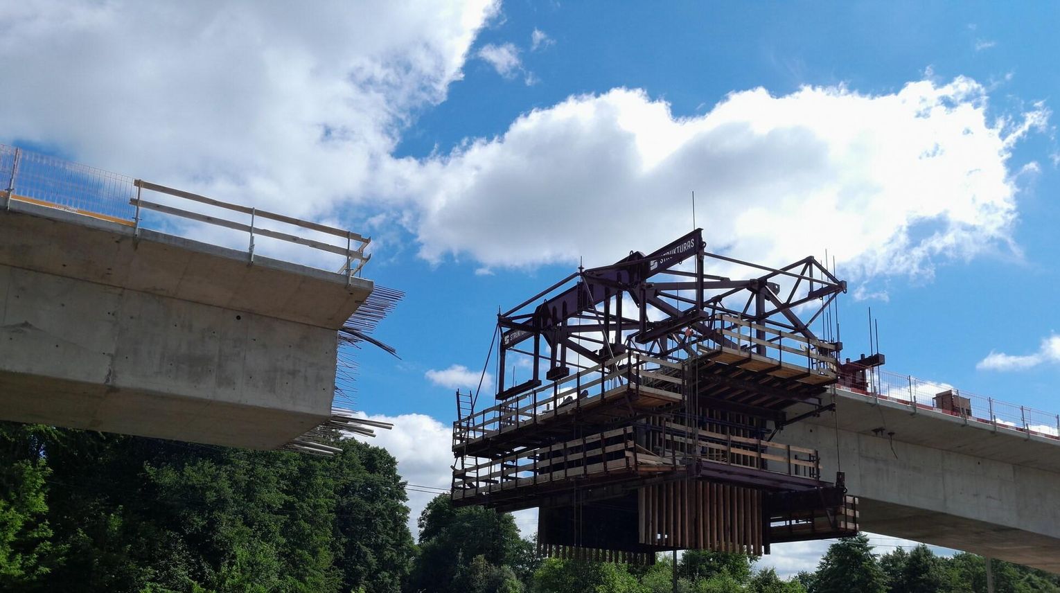 przy fundamentach oraz podporach tych obiektów, trwają natomiast prace przy wykonywaniu ustroju nośnego metodą nawisową. Polega ona na montażu deskowania i betonowaniu kolejno, jeden po drugim, segmentów konstrukcji nośnej niejako “w powietrzu”, bez podparcia rusztowaniami ustawionymi na gruncie. Proces ten powtarza się segment po segmencie z użyciem specjalnych przesuwnych urządzeń. Montaż segmentów wykonywany jest równocześnie z dwóch stron czyli od sąsiadujących ze sobą podpór w kierunku środka przęsła, aż do