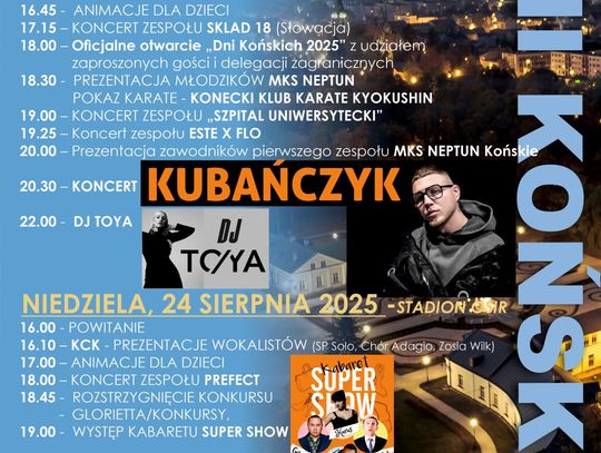 Sobota i niedziela to już dzień festynowy. Ponownie całość będzie odbywać się na stadionie OSiR przy ulicy Południowej. Start o godzinie 16. Sobotę rozpocznie występ podopiecznych Koneckiego Centrum Kultury, następnie wystąpi grupa z partnerskiego miasta ze Słowacji. O 18:30 nastąpi prezentacja drużyny młodzików MKS Neptun oraz pokaz karate. Od godziny 19 rozpocznie się blok koncertowy. Przed publicznością wystąpią kolejno: zespół Szpital Uniwersytecki, ESTO x FLO, gwiazdą wieczoru będzie Kubańczyk. Poprzedzi go prezentacja pierwszego składu MKS Neptun. Imprezę zamknie zabawy z DJ Toya.
