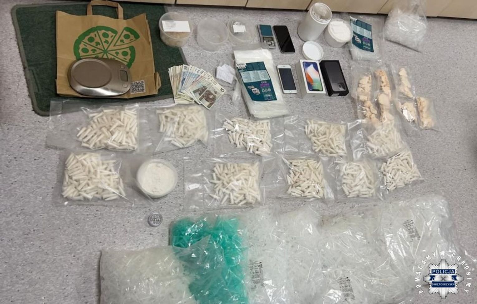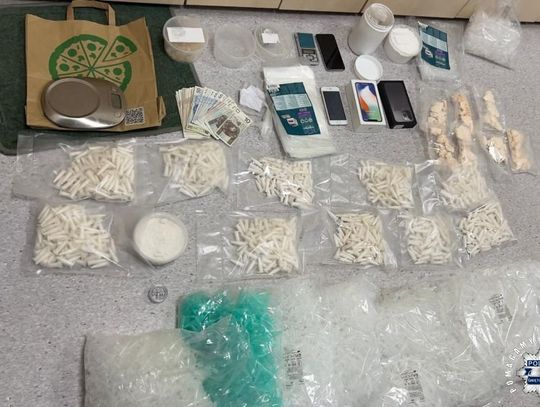 Funkcjonariusze z Wydziału Kryminalnego jędrzejowskiej komendy podejrzewali, że 30-letni mieszkaniec gminy Jędrzejów może posiadać nielegalne substancje. W czwartkowy wieczór przypuszczenia kryminalnych okazały się całkowicie słuszne. W trakcie przeszukania pojazdu należącego do mężczyzny ujawnili 80 gramów marihuany. Dzięki skrupulatnej pracy kryminalnych, po przeszukaniu pomieszczeń zajmowanych przez 30-latka, stróże prawa ujawnili więcej zabronionych substancji. Wśród zabezpieczonych specyfików znalazło się ponad 1,4 kg substancji 3-CMC, 700 gramów amfetaminy, 84 gramy marihuany oraz 314 gramów innego środka psychoaktywnego, który trafił do badań. W sumie policjanci zabezpieczyli blisko 2,5 kg narkotyków. Część z ujawnionych narkotyków była podzielona na porcje gotowe do sprzedaży.