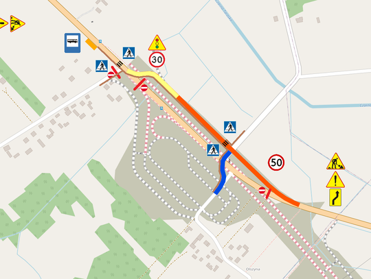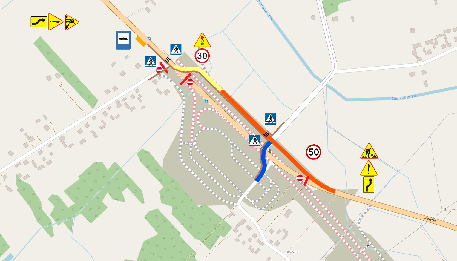 Tymczasowy objazd będzie dwukierunkowy, jednak ze względu na bezpieczeństwo, na 100-metrowym odcinku wjazdowym na bypass (od strony Piotrkowa Trybunalskiego) zostanie wprowadzony ruch wahadłowy sterowany sygnalizacją świetlną i ograniczenie prędkości do 30 km/h. Na pozostałym odcinku obowiązywać będzie ograniczenie prędkości do 50 km/h. Dotychczasowa wiata przystankowa przy DK74 będzie przesunięta o ok. 300 m w stosunku do bieżącej lokalizacji w kierunku Piotrkowa Trybunalskiego. Wyznaczone zostaną tymczasowe przejścia dla pieszych. Dla mieszkańców miejscowości Przełom, Zachybie i Muszczarz ze względu na brak wjazdu na DK74 wyznaczono objazd trasą biegnącą przez miejscowości Borki, Węgrzynów i Mniów do DK74. Dla mieszkańców wyjeżdżających z Olszyny zapewniono utwardzony kruszywem wyjazd na bypass.
