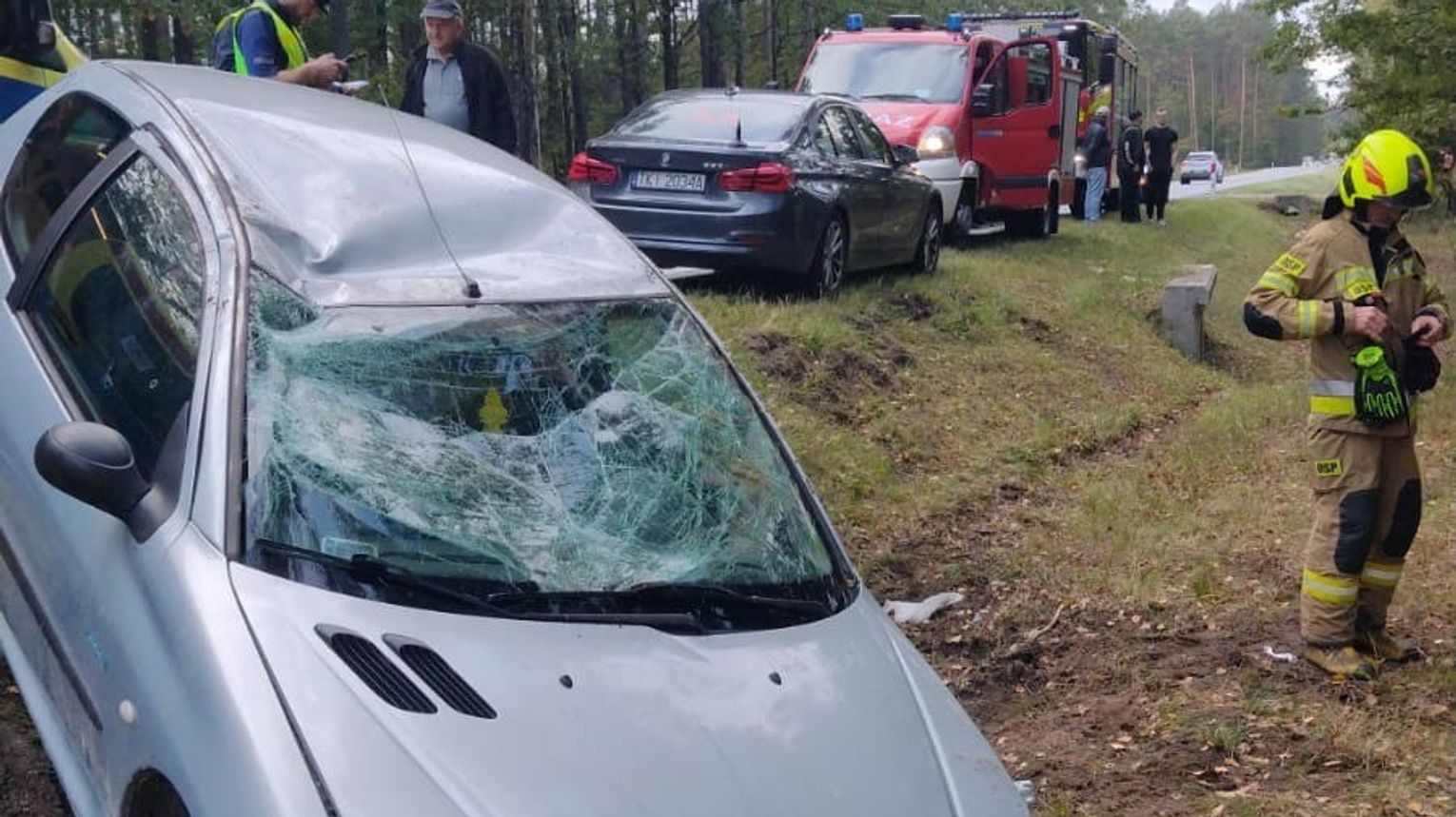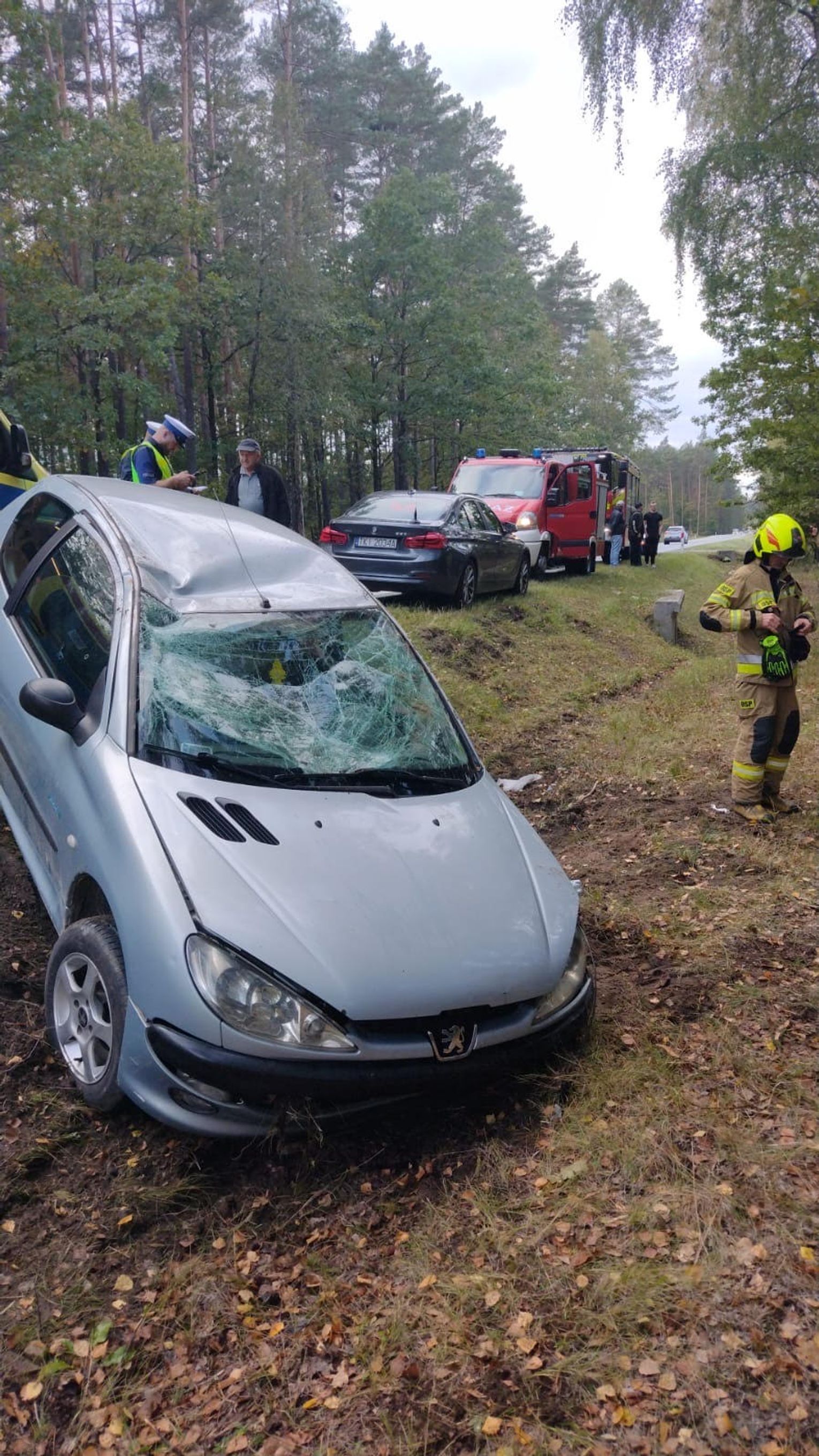 W pojeździe znajdowały się dwie osoby dorosłe, które nie odniosły obrażeń. Działania strażaków polegały na zabezpieczeniu miejsca zdarzenia, postawieniu auta na koła i odłączeniu akumulatora. W działaniach, które trwały niespełna godzinę, udział wzięły trzy jednostki straży pożarnej: JRG Końskie, OSP Miedzierza oraz OSP Radoszyce – łącznie 17 ratowników.