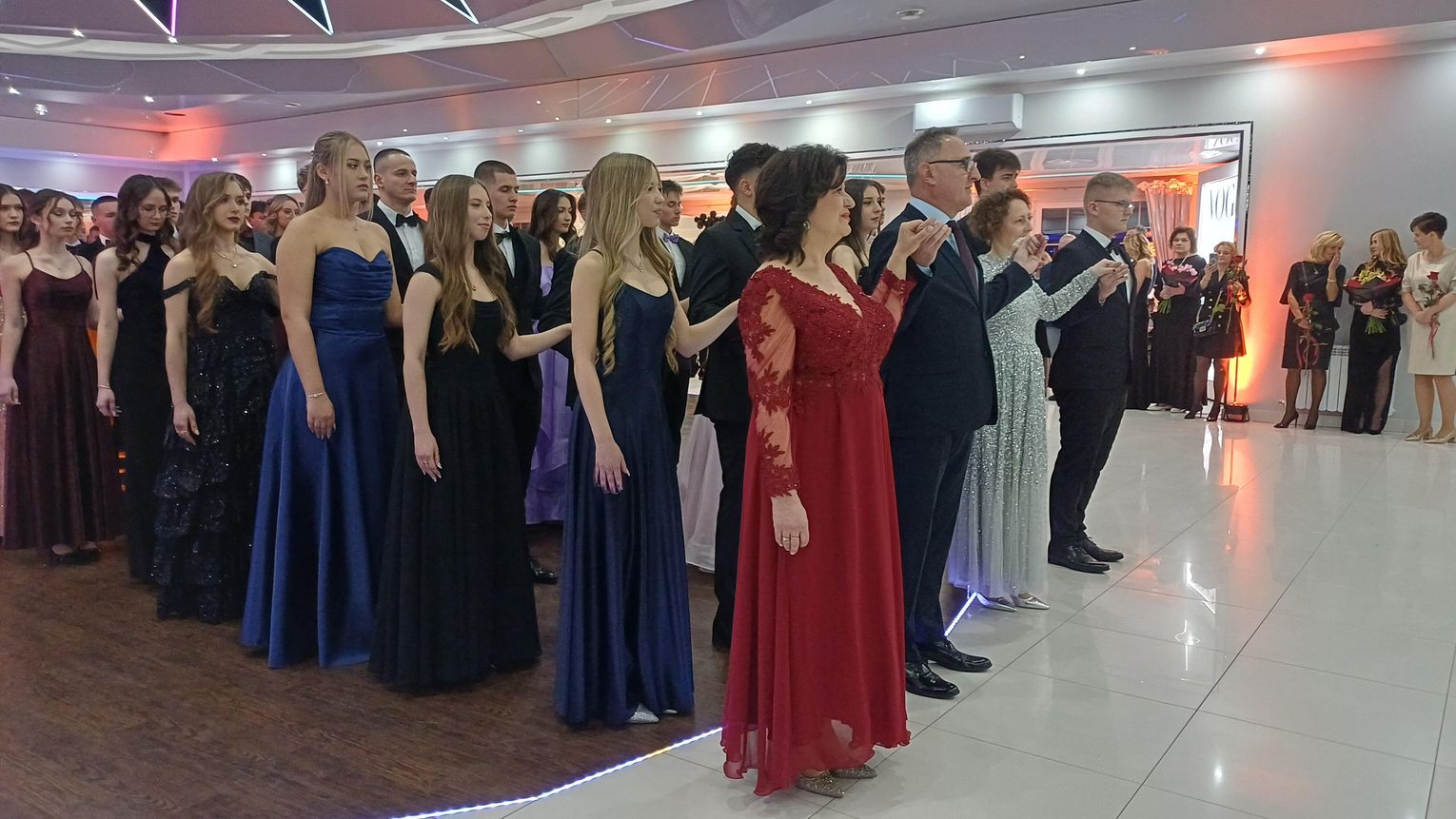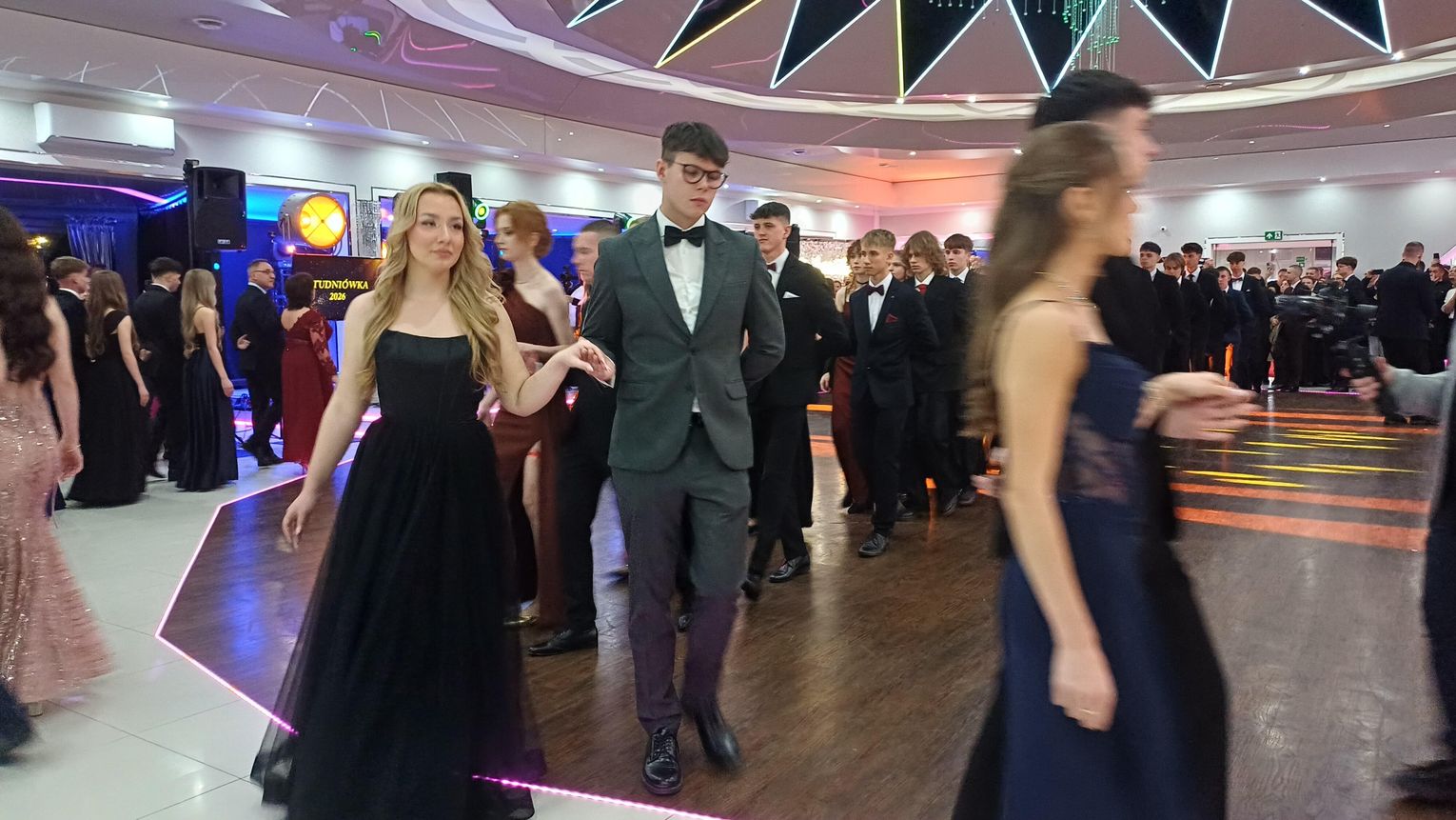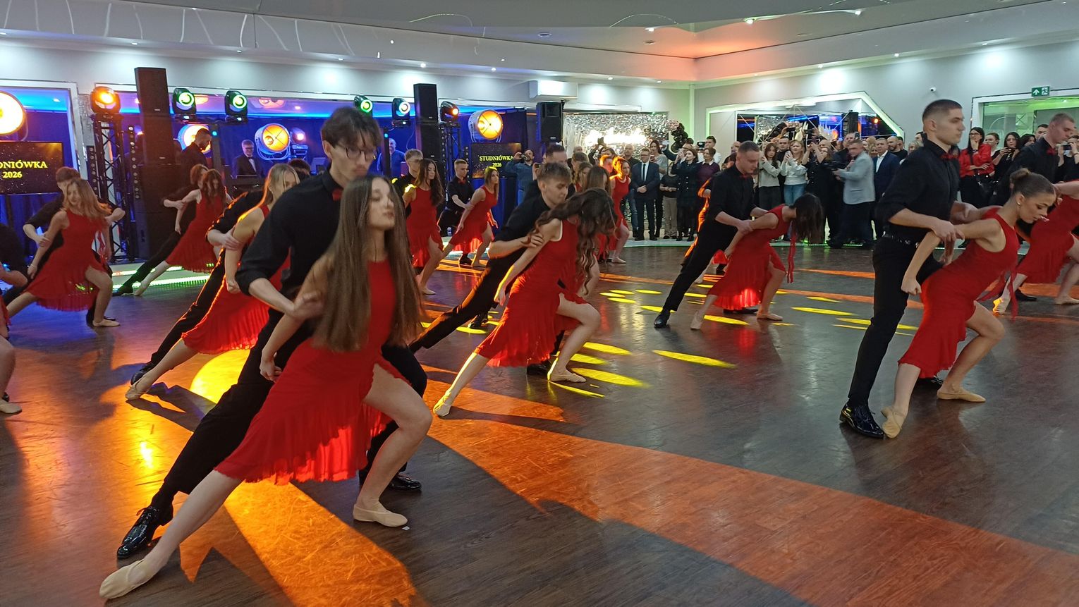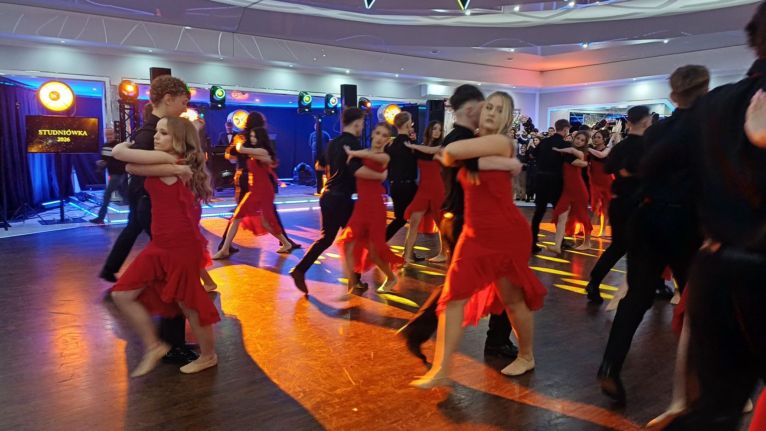 Oficjalna część rozpoczęła się od tanga. Uczniowie zaprezentowali się z ogromną klasą, a ich taniec przyciągnął uwagę wszystkich obecnych. Rodzice, nauczyciele oraz zaproszeni goście z podziwem patrzyli na młodzież, która z lekkością i pewnością poruszała się po parkiecie. Występ został nagrodzony gromkimi brawami i wzruszeniem widzów.