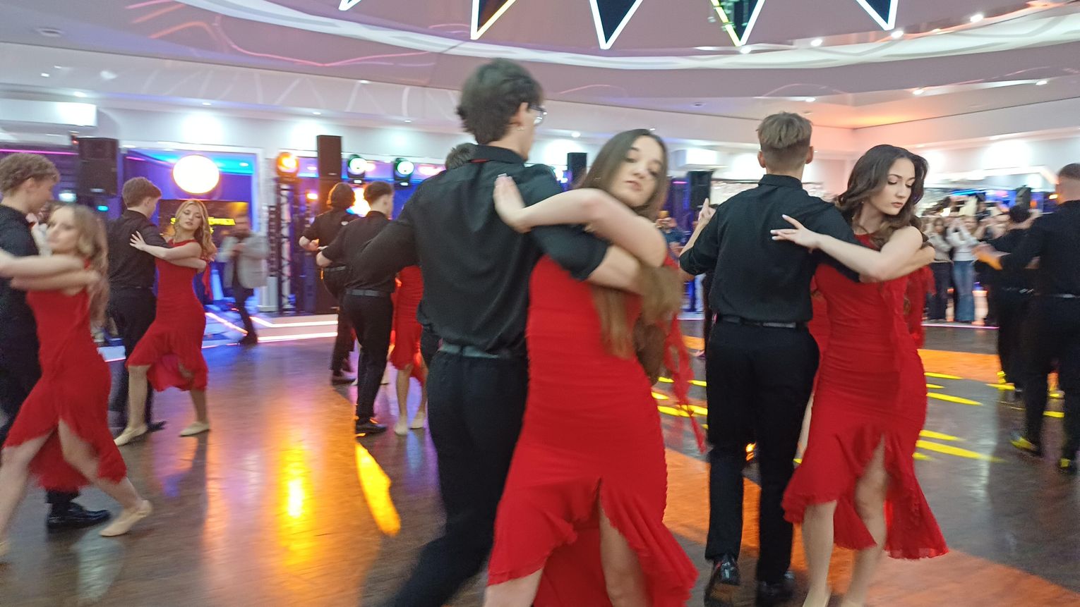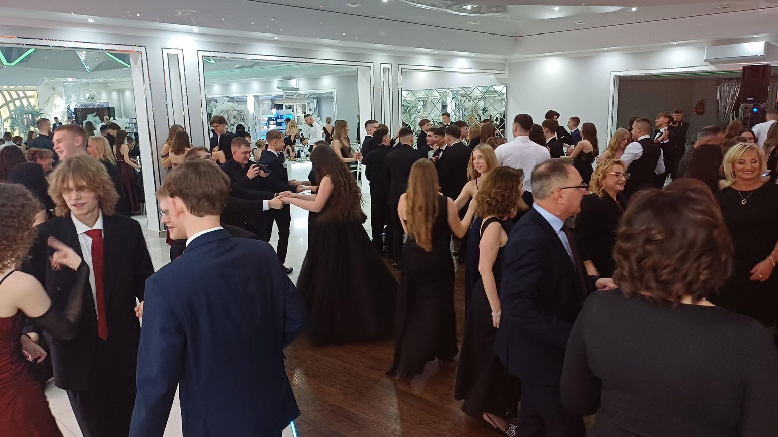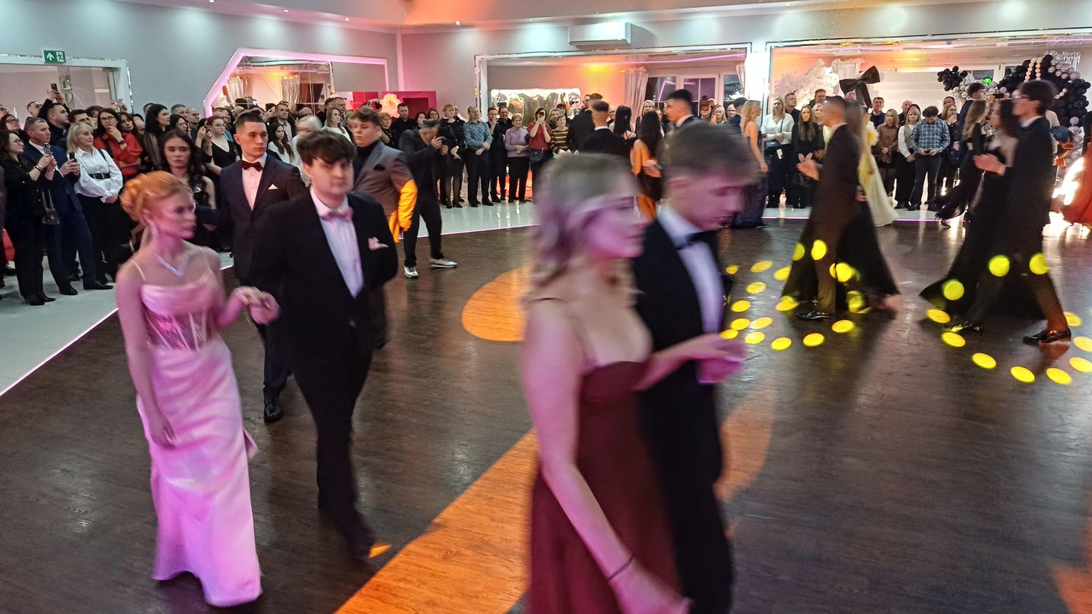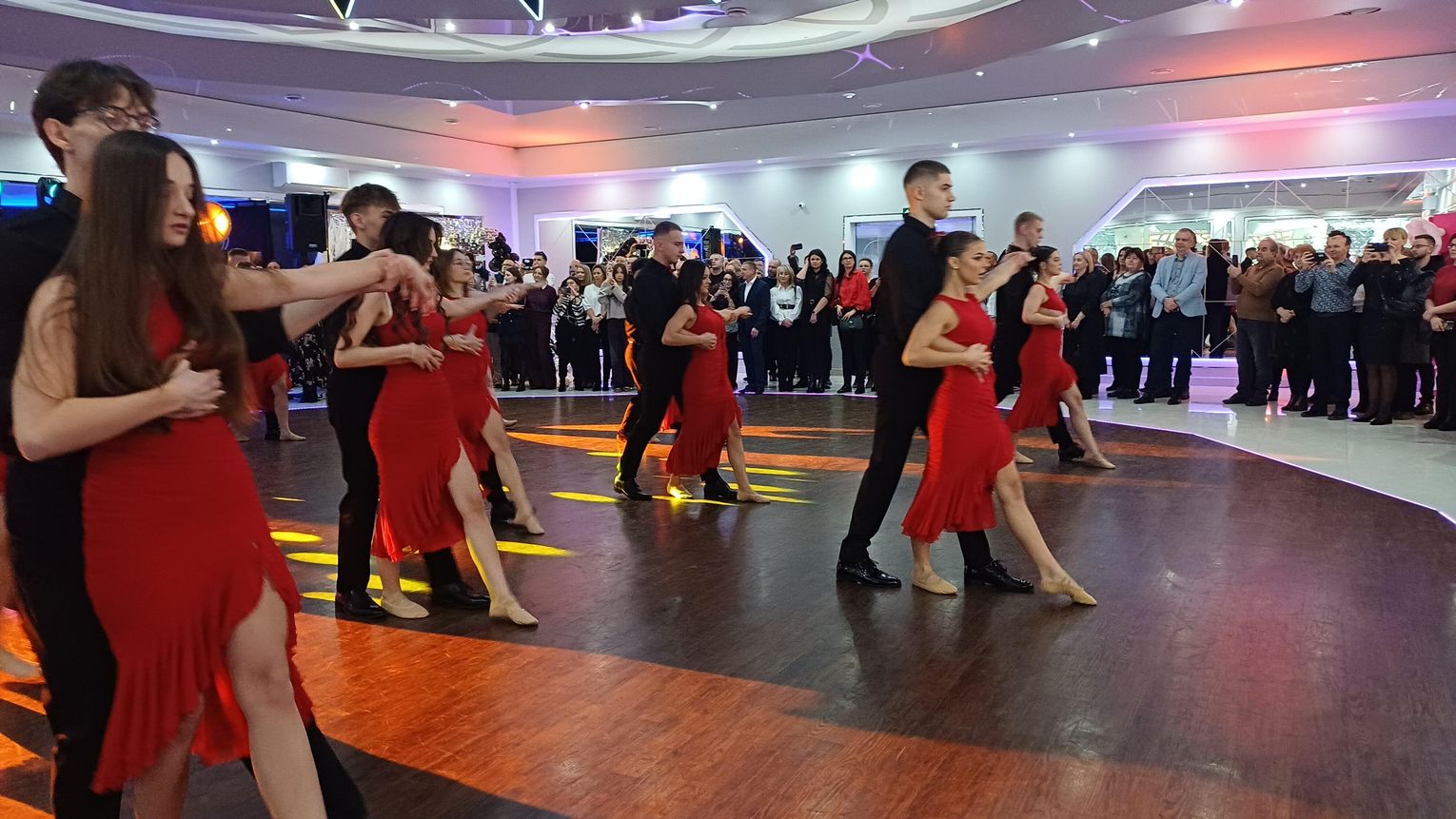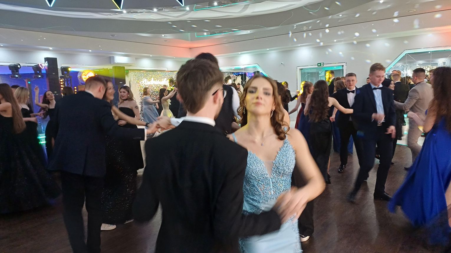 Oficjalna część rozpoczęła się od tanga. Uczniowie zaprezentowali się z ogromną klasą, a ich taniec przyciągnął uwagę wszystkich obecnych. Rodzice, nauczyciele oraz zaproszeni goście z podziwem patrzyli na młodzież, która z lekkością i pewnością poruszała się po parkiecie. Występ został nagrodzony gromkimi brawami i wzruszeniem widzów.