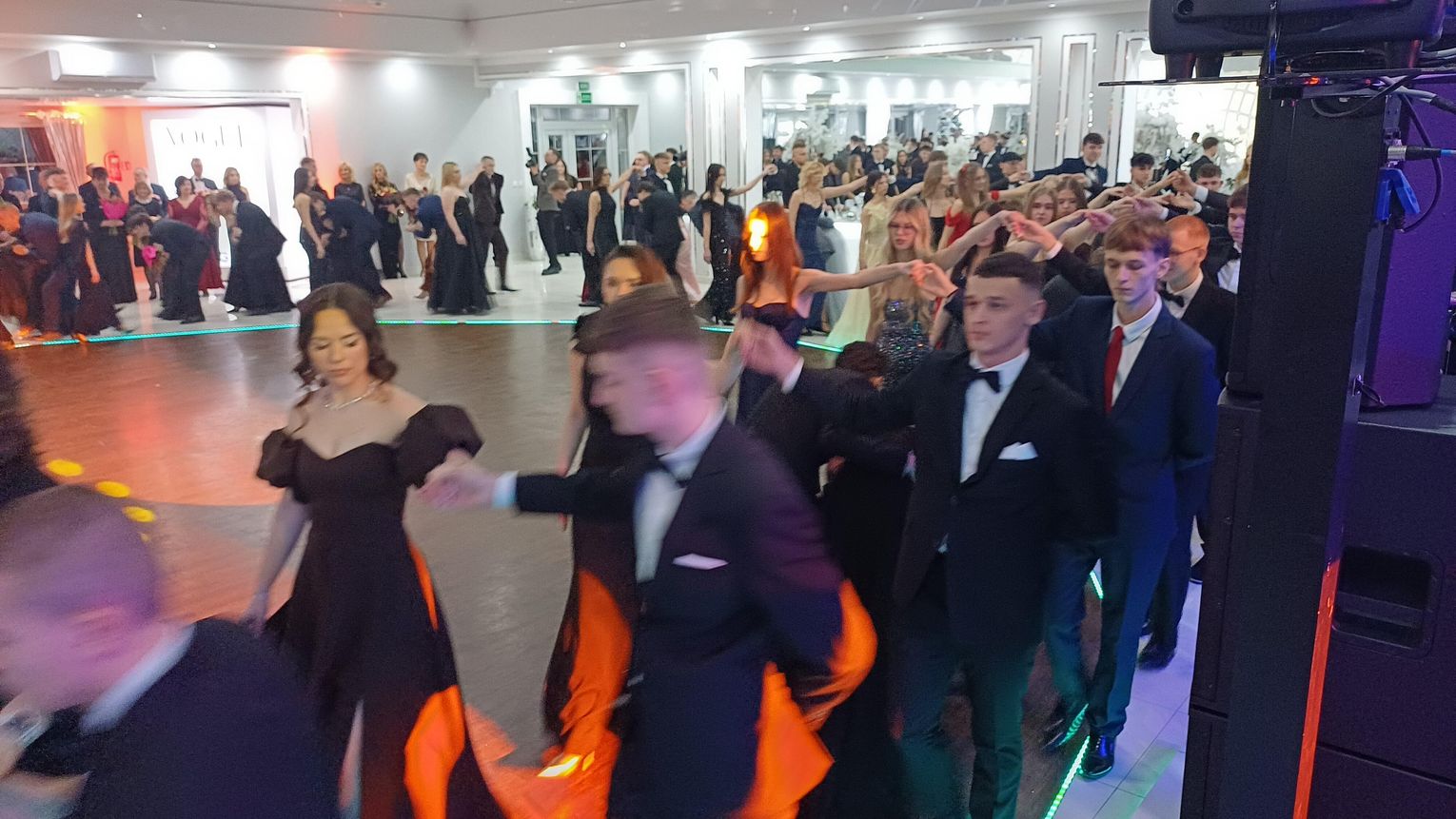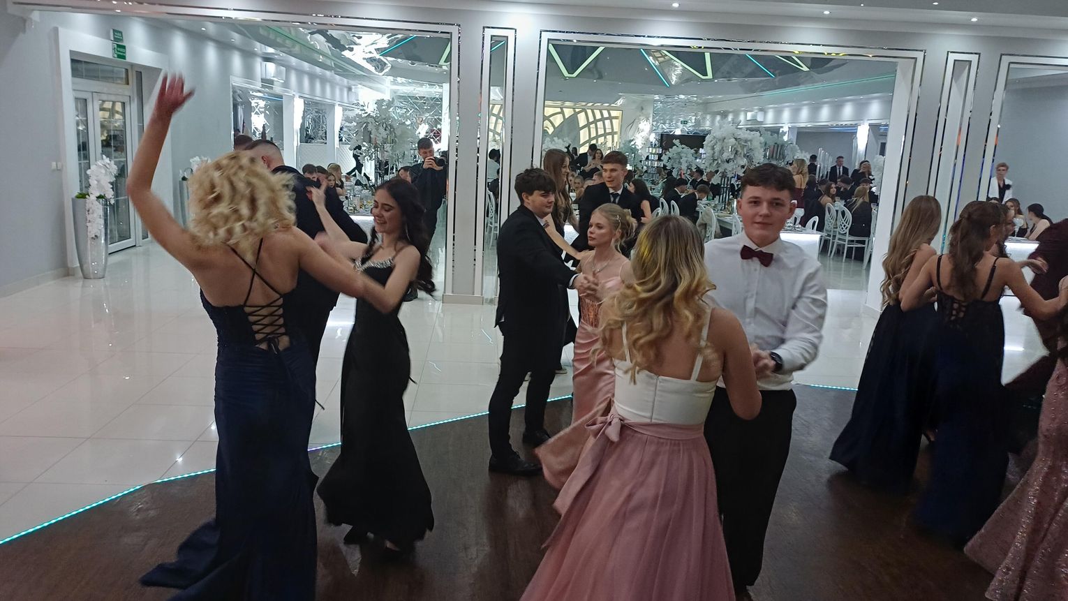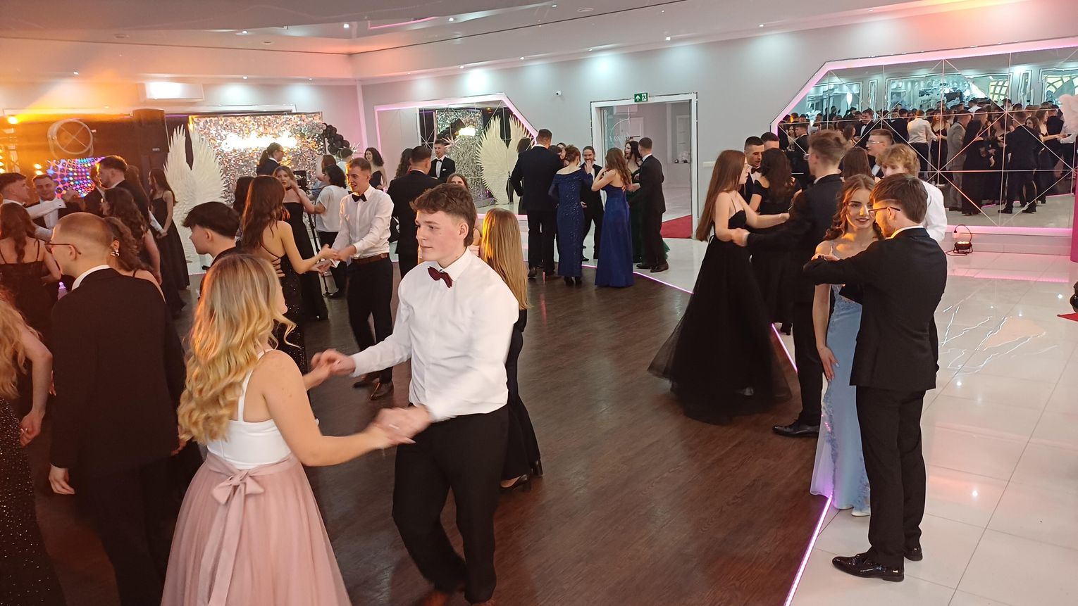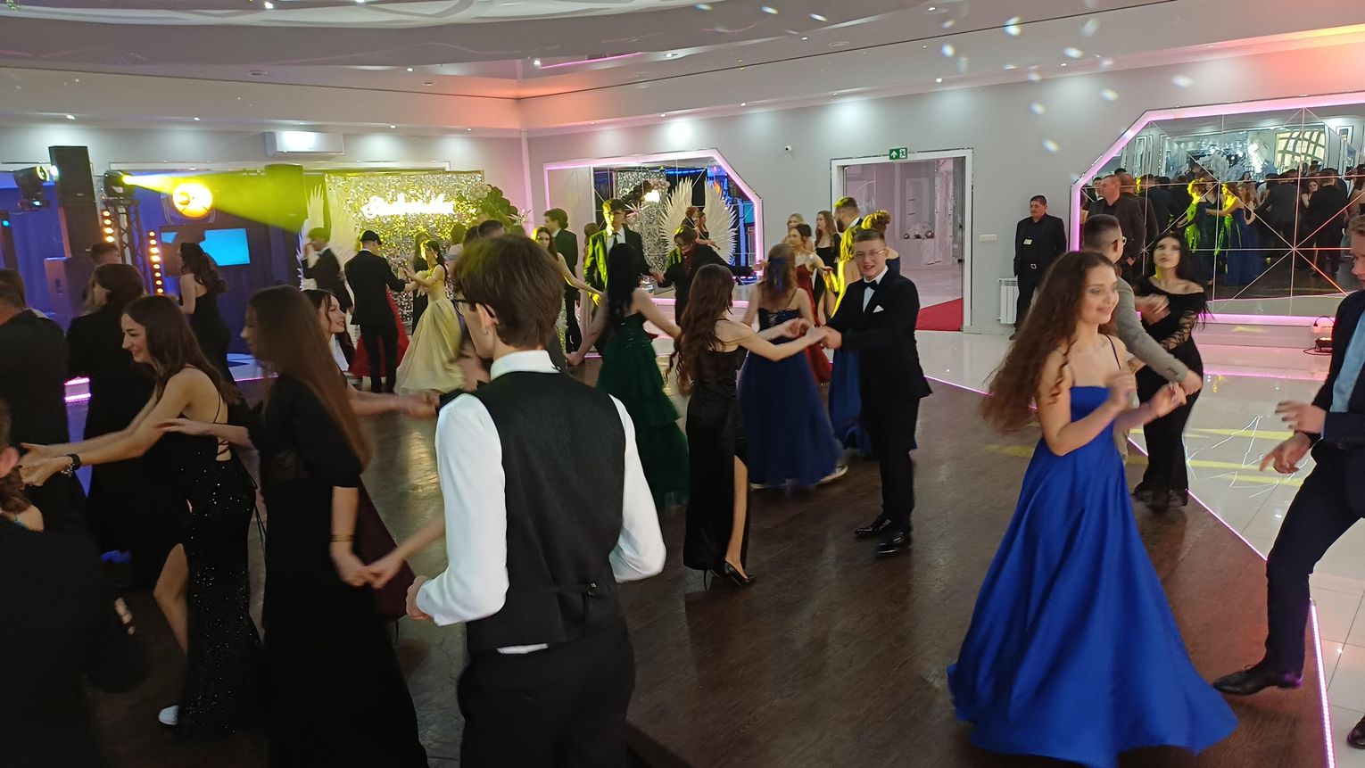 Oficjalna część rozpoczęła się od tanga. Uczniowie zaprezentowali się z ogromną klasą, a ich taniec przyciągnął uwagę wszystkich obecnych. Rodzice, nauczyciele oraz zaproszeni goście z podziwem patrzyli na młodzież, która z lekkością i pewnością poruszała się po parkiecie. Występ został nagrodzony gromkimi brawami i wzruszeniem widzów.