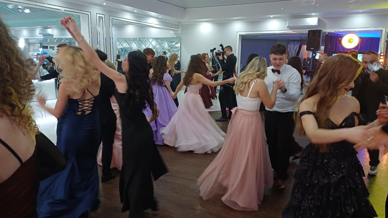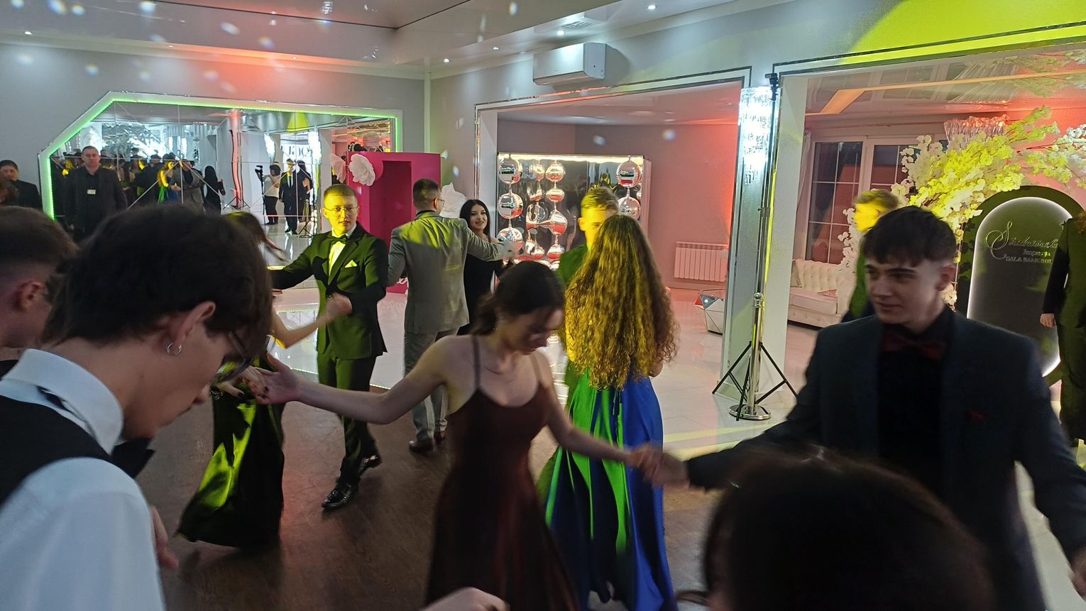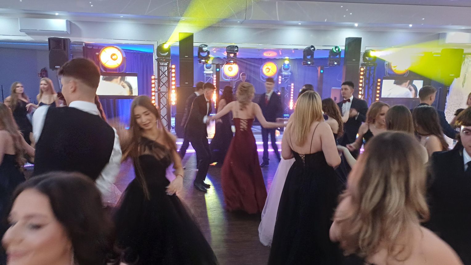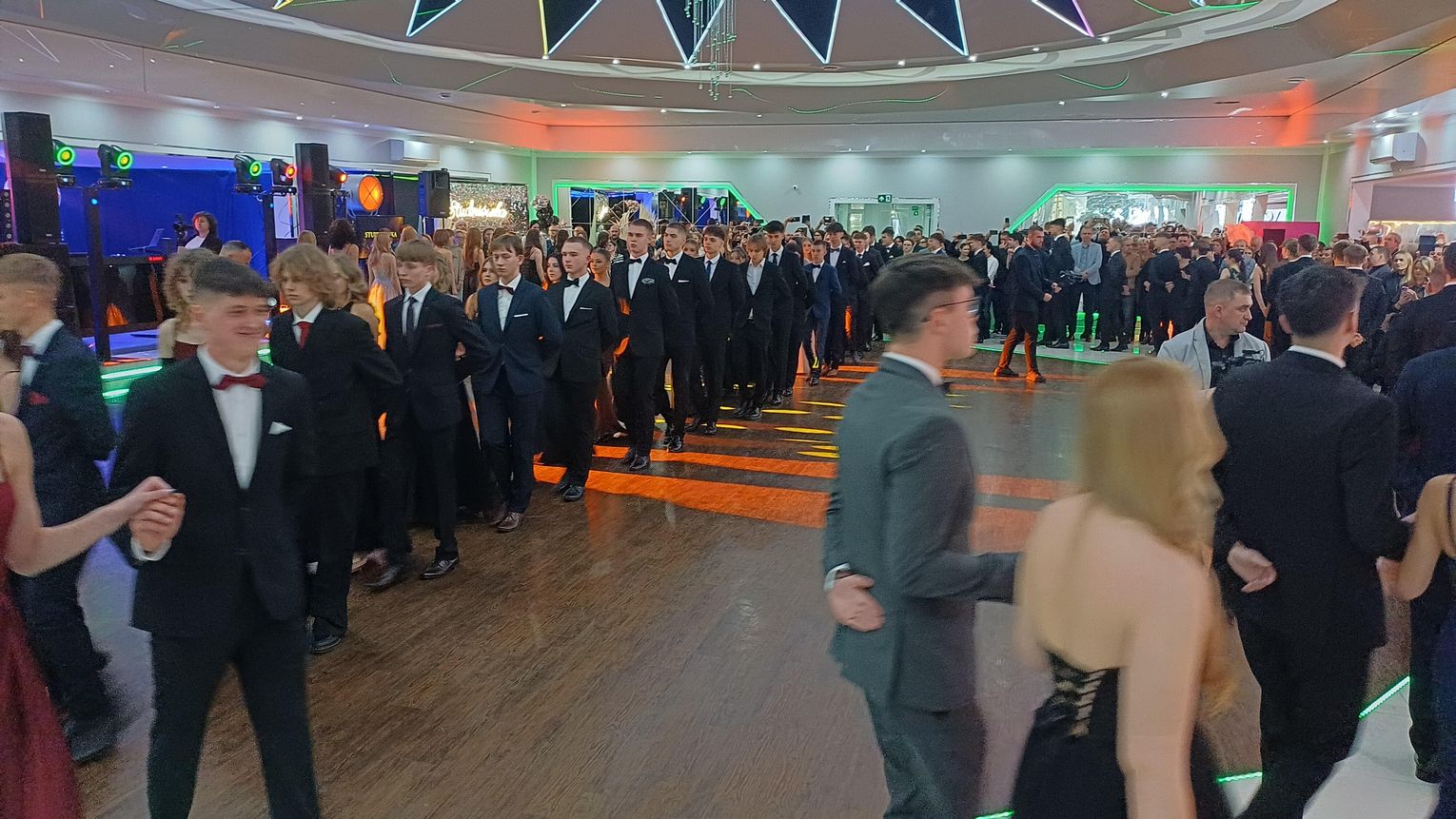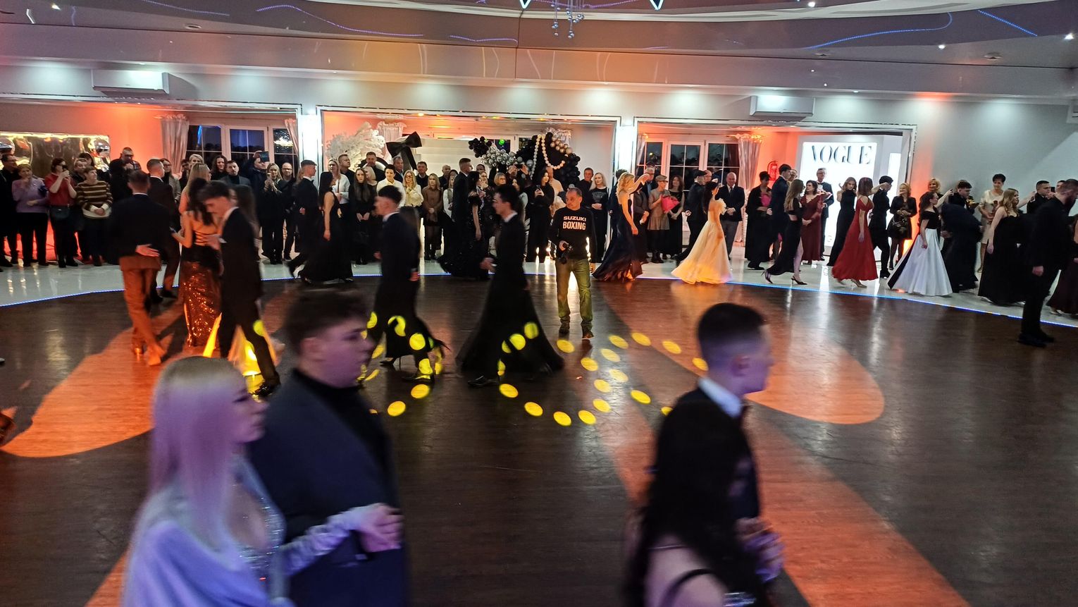 Oficjalna część rozpoczęła się od tanga. Uczniowie zaprezentowali się z ogromną klasą, a ich taniec przyciągnął uwagę wszystkich obecnych. Rodzice, nauczyciele oraz zaproszeni goście z podziwem patrzyli na młodzież, która z lekkością i pewnością poruszała się po parkiecie. Występ został nagrodzony gromkimi brawami i wzruszeniem widzów.
