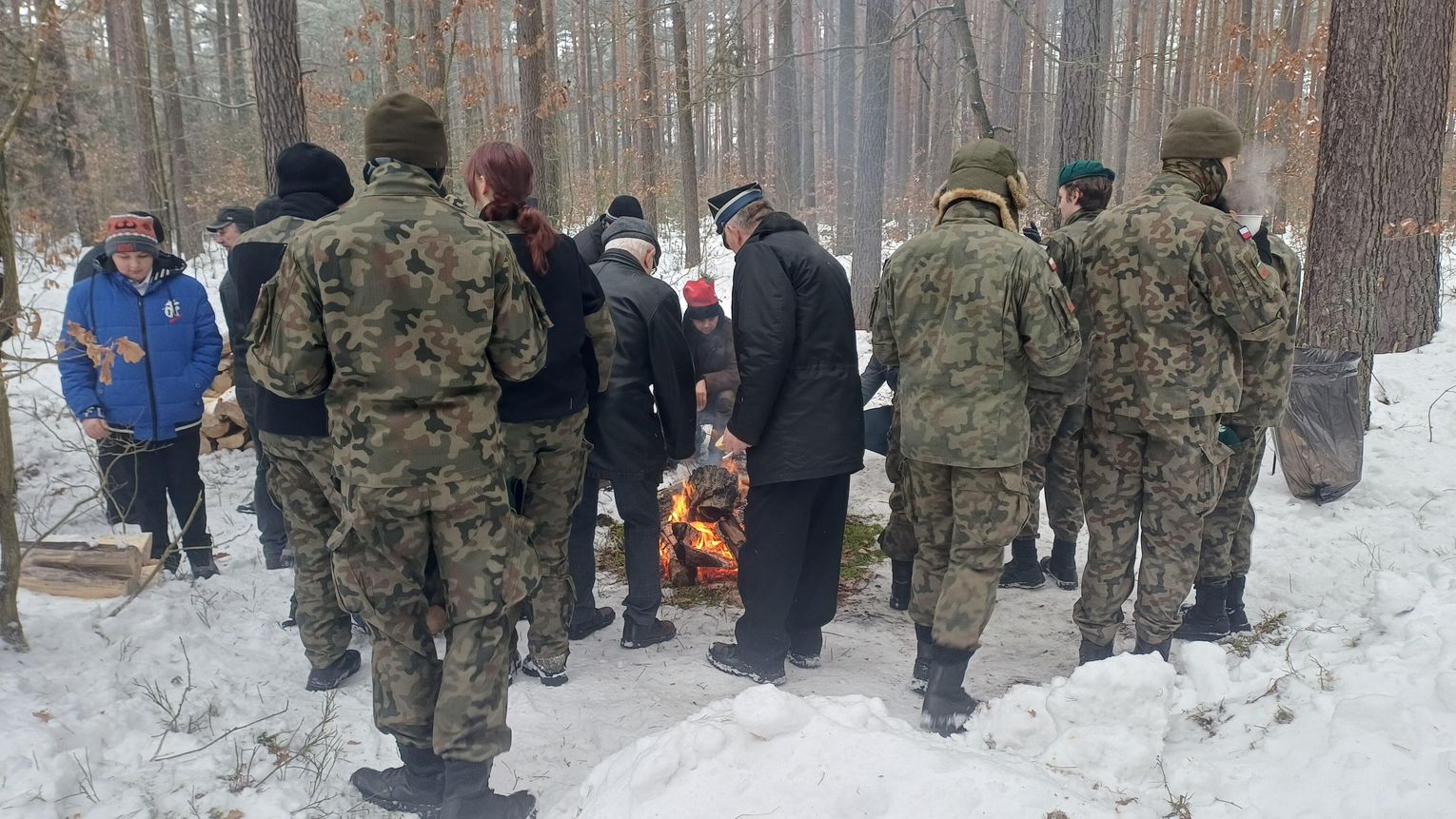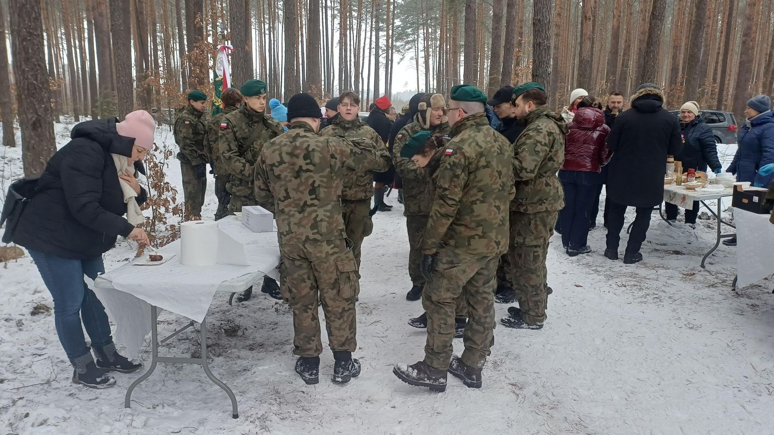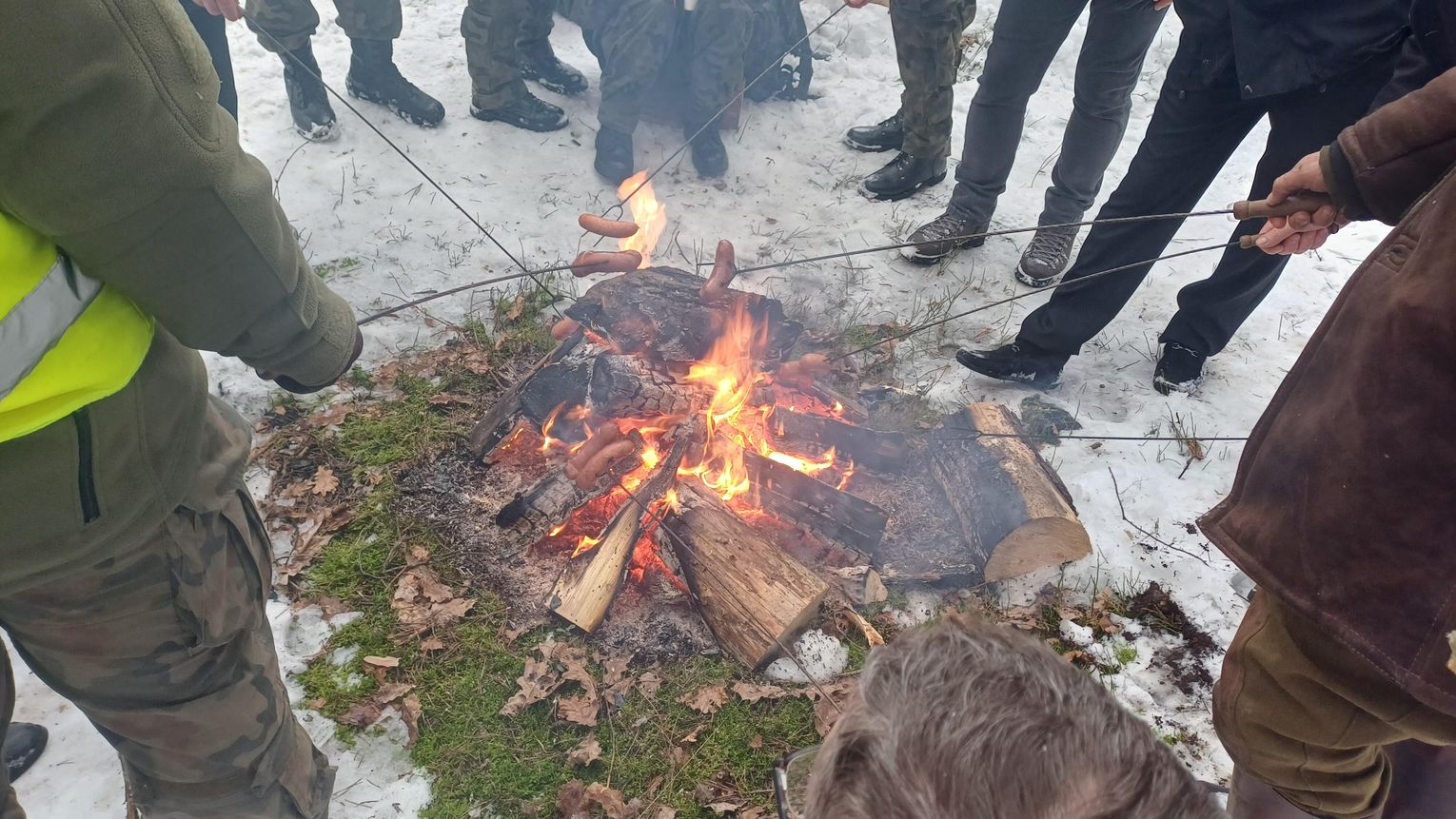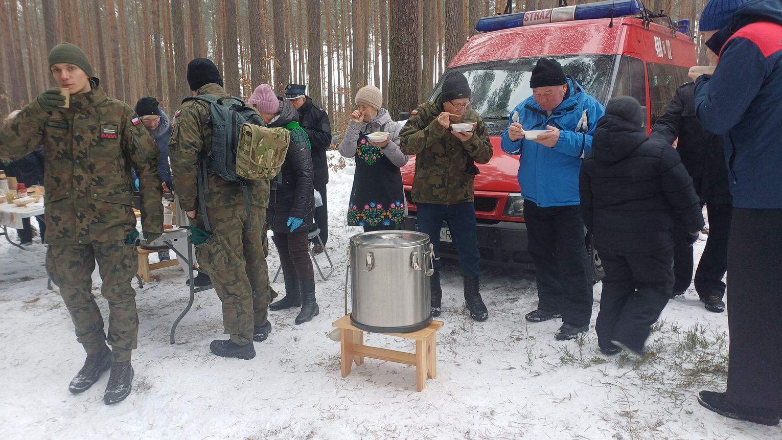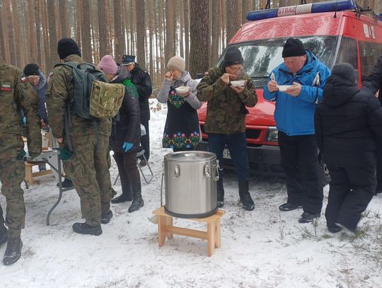 Po oficjalnej części uczestnicy mogli ogrzać się przy ognisku. Członkinie Koła Gospodyń Wiejskich „Kierzanki” przygotowały tradycyjną grochówkę, a na wszystkich czekała gorąca herbata i możliwość upieczenia kiełbasy – co było szczególnie cenne w mroźny poranek.