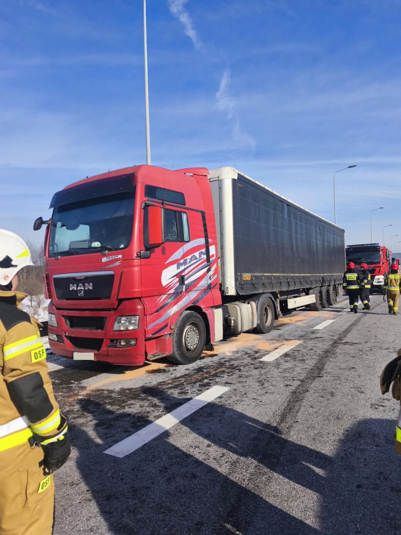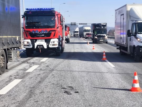 Na miejscu działania ratownicze realizowali strażacy z okolicznych jednostek, którzy przede wszystkim zabezpieczyli rejon zdarzenia i przystąpili do schładzania rozgrzanej turbiny silnika. Użyto kamery termowizyjnej do dokładnego sprawdzenia pojazdu i naczepy pod kątem ewentualnych zarzewi ognia, co jest standardową procedurą w takich akcjach, aby wykluczyć ryzyko ponownego zapłonu. Dodatkowo strażacy sorbentami pochłonęli wyciekający olej napędowy i inne płyny eksploatacyjne, które mogły stanowić zagrożenie dla ruchu drogowego.