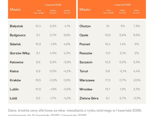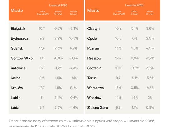 Jak wynika z danych Nieruchomosci-online.pl, I kwartał 2026 r. przyniósł wiele przypadków wzrostu średniej ceny ofertowej mieszkań z rynku wtórnego. Kwartalne zmiany nie były wprawdzie duże, ale w oczy rzuca się to, że pojawiły się w wielu miastach wojewódzkich.
