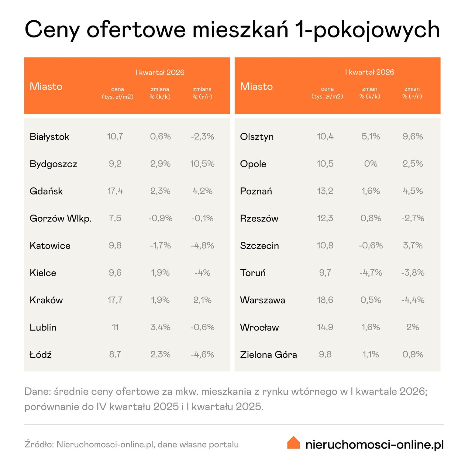 W segmencie kawalerek średnia cena ofertowa spadła w porównaniu do IV kwartału 2025 r. jedynie w Katowicach (o ponad 1% do poziomu 9,8 tys. zł) i Toruniu (o 4% do poziomu 9,7 tys. zł). Przeciętne oczekiwania osób sprzedających ustabilizowały się natomiast w Białymstoku (10,7 tys. zł), Gorzowie Wlkp. (7,5 tys. zł), Opolu (10,5 tys. zł), Rzeszowie (12,3 tys. zł), Szczecinie (10,9 tys. zł) i Warszawie (18,6 tys. zł) – wszędzie tam wahania wynosiły mniej niż 1% k/k, a więc były minimalne.