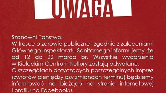 Kieleckie Centrum Kultury odwołuje wszystkie imprezy na najbliższe dwa tygodnie.